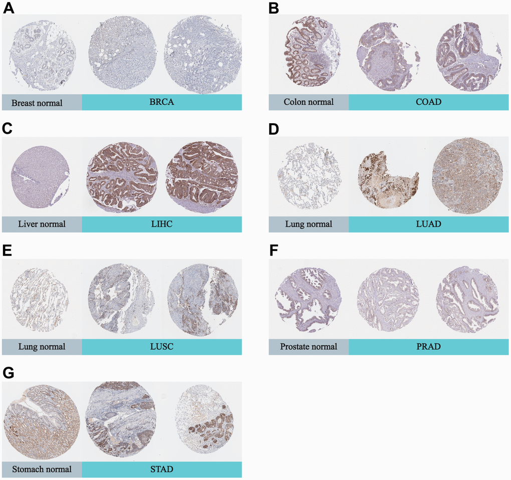 In addition, we utilized the Human Protein Atlas (HPA) database to compare the expression of DLAT in normal and tumor samples at the protein level. Strong staining of DLAT was observed in STAD tissues, in contrast to the normal stomach, which had only weak immunohistochemistry (IHC) staining (Figure 2). DLAT staining was found to be moderate in samples of normal liver tissue, but the staining was strong in samples of tumor tissues. The DLAT staining in normal lung tissues was weak, whereas that of LUSC tissues was moderate and strong in LUAD tissues. Conversely, DLAT staining was strong in samples of normal colon and prostate tissues but only moderate in tumor tissue samples. DLAT staining was moderate in normal breast tissue samples but weak in cancer tissues.