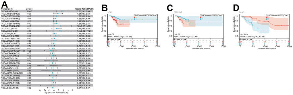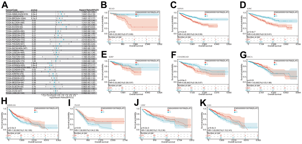 To explore the potential prognostic value of DLAT in cancer, the survival data of OS, DSS, DFI, and PFI downloaded from TCGA were analyzed. For each different form of cancer, we used both the Cox regression analysis and the KM survival method to analyze the survival data. The threshold value for categorizing patients into two groups was determined according to each tumor’s median value of DLAT expression. The R packages “forestplot,” “survminer,” and “survival” were employed to visually represent the data.