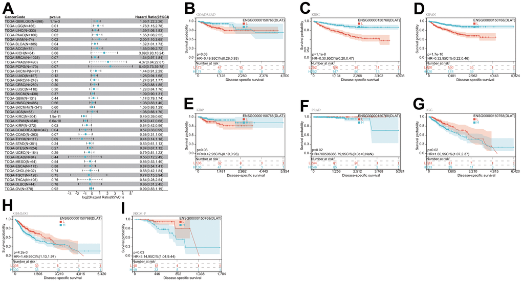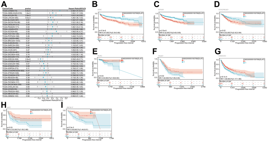 After that, we examined the role of DLAT expression in tumor survival outcomes. For overall survival (OS), DLAT functioned as a risk factor in bladder urothelial carcinoma (BLCA), BRCA, GBMLGG, LGG, LIHC, PAAD, and UVM based on the analyses of Cox regression. In contrast, it functioned as a protective factor in COAD, COADREAD, KIPAN, KIRC, and READ. The Kaplan-Meier (KM) analysis on the OS illustrated that high levels of DLAT expression were related to dismal prognoses in patients suffering from BRCA, GBMLGG, LGG, LIHC, and PAAD, but a favorable prognosis was found in COADREAD, KIPAN, KIRC, KIRP, and READ (Figure 3B–3K). Subsequently, Cox regression analysis of the disease-specific survival (DSS) showed that DLAT was a risk factor for six distinct cancers, including BLCA, GBMLGG, LGG, LIHC, PAAD, and UVM. On the other hand, as shown in Figure 4A, it was a protective factor in COADREAD, KIPAN, KIRC, and KIRP. Figure 4B–4E show that a high level of DLAT expression was associated with a favorable DSS for the COADREAD, KIPAN, KIRC, and KIRP based on the results of KM analysis. However, poor DSS was found in patients with high DLAT expression levels in GBMLGG, LGG, PRAD, and primary skin cutaneous melanoma (SKCM-P) (Figure 4F–4I). Additionally, the findings result from Cox regression analysis showed that DLAT was a risk factor for disease-free interval (DFI) in PAAD (Figure 5A). Further KM analysis demonstrated that patients with PAAD whose DLAT expression was higher exhibited a poorer DFI in contrast with those whose DLAT expression was lower, and reversely in GBMLGG and LGG (Figure 5B–5D). Lastly, for progression-free interval (PFI), DLAT served as a risk factor in patients with adrenocortical carcinoma (ACC), BLCA, cervical squamous cell carcinoma and endocervical adenocarcinoma (CESC), GBMLGG, LIHC, PAAD, SKCM-P, and UVM but was found to be a protective factor in KIPAN and KIRC according to the Cox regression analysis findings (Figure 6A). Furthermore, an unfavorable PFI was found in patients exhibiting high levels of DLAT expression in ACC, GBMLGG, PAAD, pheochromocytoma and paraganglioma (PCPG), and SKCM-P based on the results of KM analysis, while opposite results were found in COADREAD, KIPAN, and KIRC, as depicted in Figure 6B–6I.