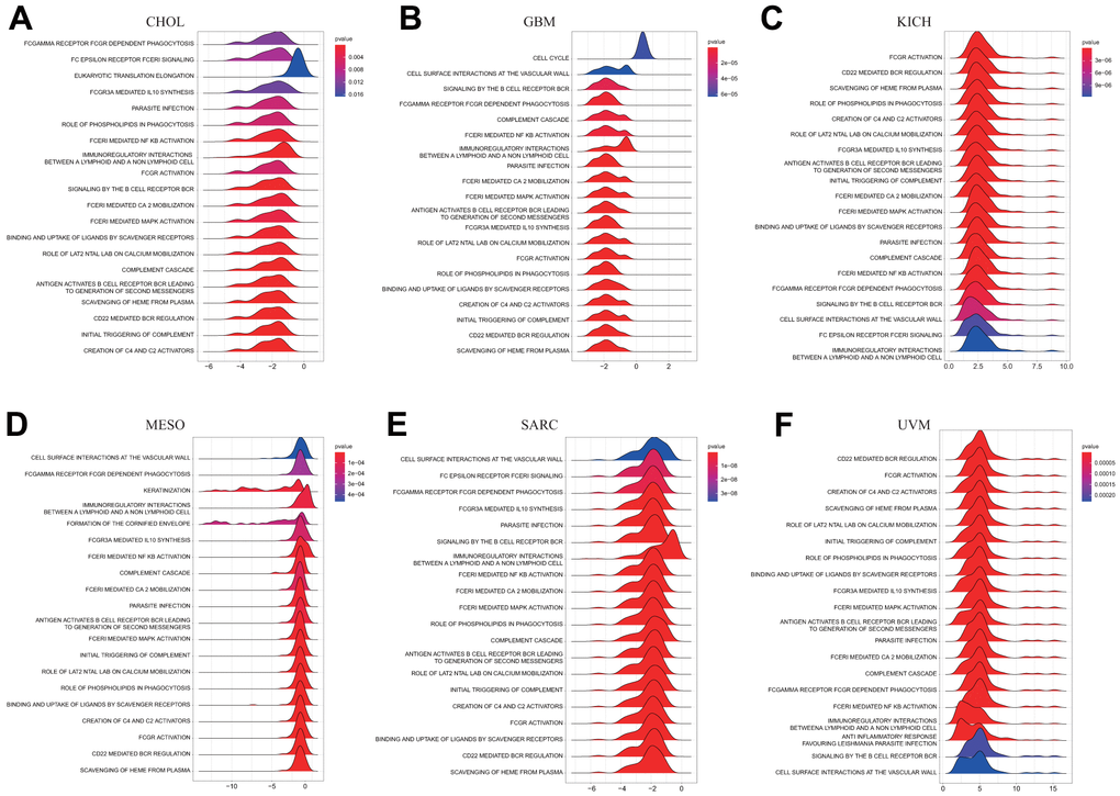 We conducted a GSEA analysis to identify the pathways in which DLAT may be involved, in order to better understand the potential biological processes underlying DLAT expression in different cancer tissues. Interestingly, our results showed that several types of tumors exhibited similar GSEA results. The findings demonstrated that DLAT is implicated in immune modulation-associated pathways in pan-cancer, such as “Antigen activates B Cell Receptor (BCR) leading to generation of second messengers,” “CD22 mediated BCR regulation,” “FCGR activation,” “FCGR3A-mediated IL10 synthesis,” “FCERI mediated Ca+2 mobilization,” “FCERI mediated MAPK activation,” “complement cascade,” “Role of LAT2/NTAL/LAB on calcium mobilization,” and “Immunoregulatory interactions between a Lymphoid and a non-Lymphoid cell” (Figure 8A–8F). As per these findings, DLAT possibly performs an instrumental function in modulating cancer immunity.