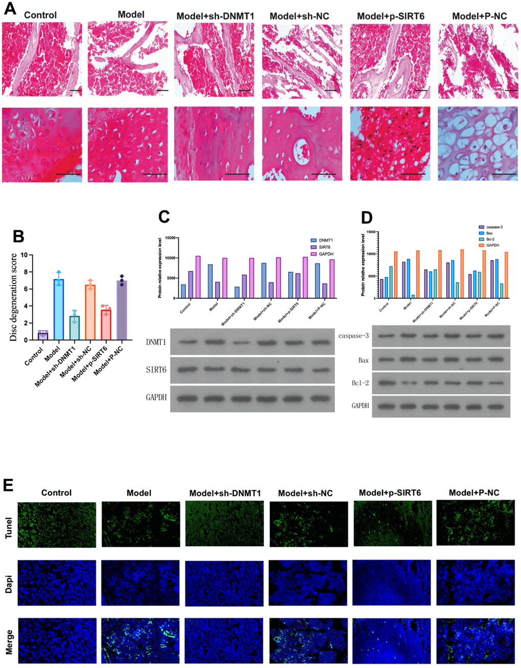 On the other hand, the IDD model groups showed distinct degenerative changes. The NPCs were scattered, and the number of notochordal cells was lower than that in the sham surgery group. Moreover, NPCs were replaced by small and long fibroblast-like cells, and round chondrocytes were often observed. However, these degenerative changes were obvious in the model, model + sh-NC, and model + P-NC groups, whereas the model +sh-DNMT1 and model + p-SIRT6 groups were less affected.