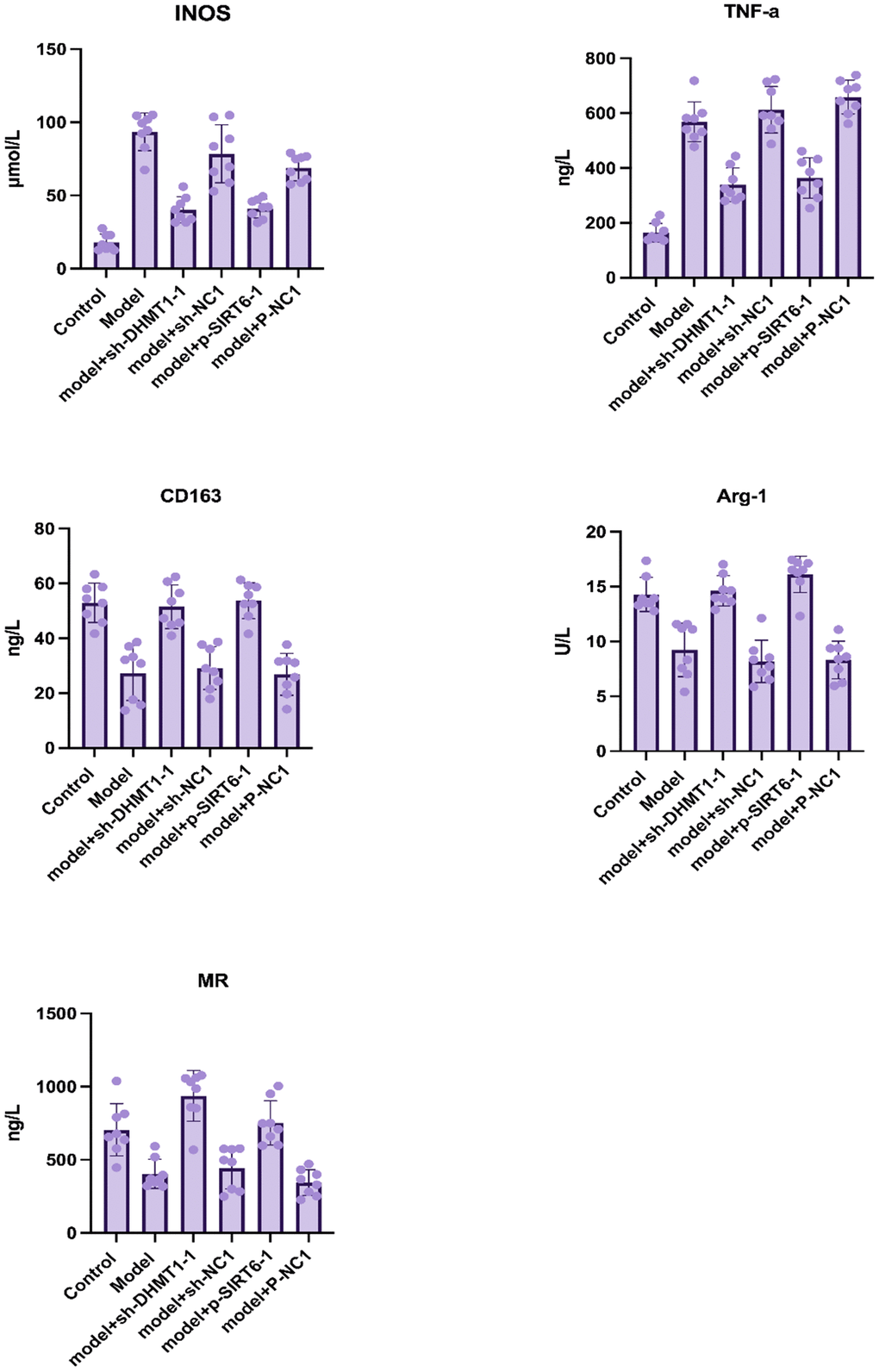 ELISA was used to detect the expression level of macrophage M1/M2 markers in nucleus pulposus tissue fluids. Investigated M1 macrophage-specific markers were iNOS and TNF-α. While CD163, Arg-1, and MR were the studied M2 macrophage-specific markers. The results suggested that inhibition of DNMT1 and overexpression of SIRT6 could significantly decrease the expression of M1 macrophage specific markers and increase the expression of M2 macrophage specific markers, which play a role in nucleus pulposus regeneration (Figure 2).