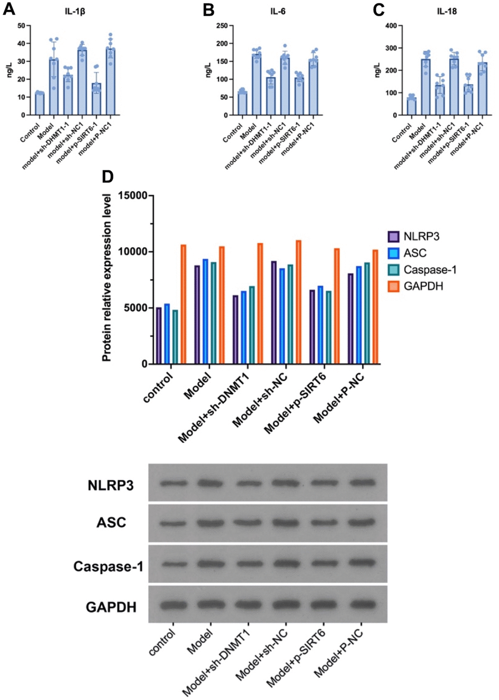 The NLRP3, ASC and caspase-1 proteins were detected in nucleus pulposus by western blot, and the expression of IL-1β, IL-6, and IL-18 was detected by ELISA to investigate the effect of silencing the DNMT1 or overexpressing SIRT6 on inhibiting the NPCs’ pyroptosis in an inflammatory environment. ELISA results showed that silencing the DNMT1 or overexpressing SIRT6 can significantly inhibit the expression of pyroptosis markers IL-1β, IL-6, and IL-18 (p<0.05), which can accelerate degeneration of the intervertebral disc (Figure 3A–3C). Moreover, in the western blot analysis, the expression of NLRP3, ASC and caspase-1 were significantly decreased in model +sh-DNMT1 and model + p-SIRT6 groups (p<0.05) (Figure 3D).