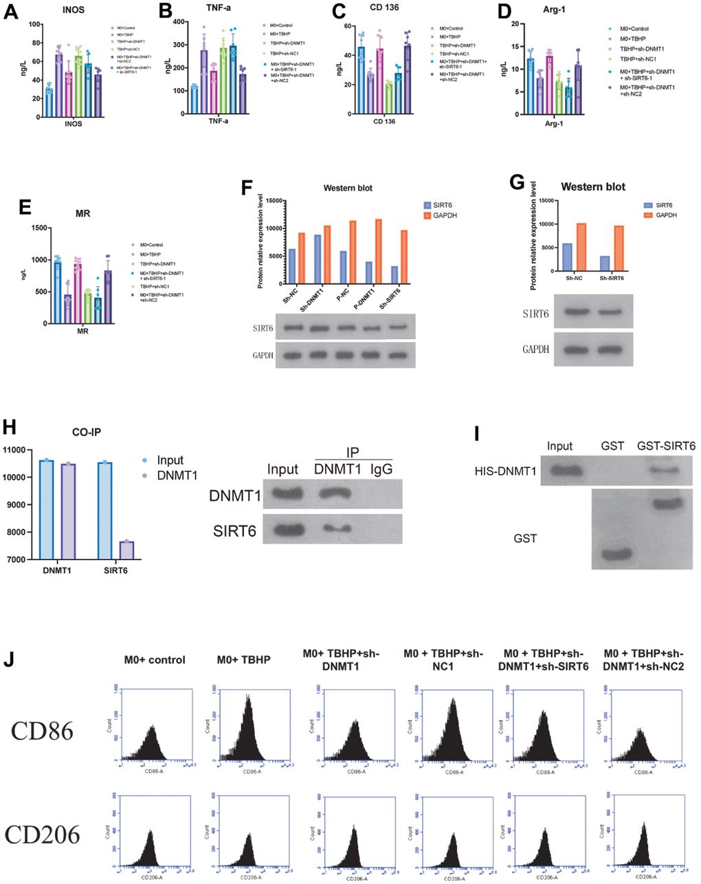 Moreover, Co-IP experiments also revealed that DNMT1 has an interaction with SIRT6 in NPCs (Figure 4H). The expression of the M1 macrophages specific markers (iNOS and TNF- α) (Figure 4A, 4B), and the expression of M2 macrophage specific markers CD163, Arg-1 and MR were detected by ELISA (Figure 4C–4E). The M1 macrophages markers (iNOS and TNF-α) were presented in a significant low concentration in the sh-DNMT1 and sh-DNMT1+sh-NC2 TBHP -treated NPCs (p< 0.05) Figure (4A, 4B). Interestingly, the same groups showed the highest concentration of the M2 macrophages markers with p< 0.05. That is to say, the levels CD163, Arg-1 and MR were markedly increased when DNMT1was inhibited (Figure 4C–4E), and the levels of iNOS and TNF-α were decreased when DNMT1 was inhibited (p<0.05) Figure (4A, 4B).