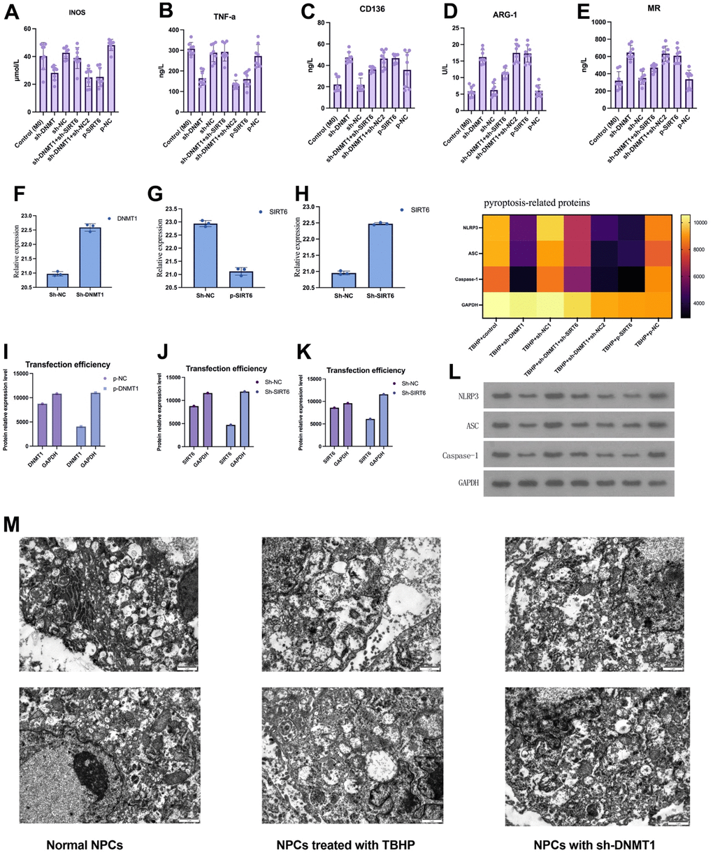 Pyroptosis is closely related to inflammation. Herein, we investigated the role of DNMT1/SIRT6 axis in pyroptosis by studying its effect on macrophage polarization. The expression of M1 macrophage iNOS and TNF-α (Figure 5A, 5B), and the expression of M2 macrophage specific markers CD163, Arg-1 and MR were detected by ELISA (Figure 5C–5E). The M1 macrophages markers including iNOS and TNF-a were significantly decreased in the group with inhibited DNMT1 and overexpressed SIRT6 (p< 0.05). On the other hand, the M1 macrophage markers were significantly increased in the group with inhibited DNMT1 and overexpressed SIRT6 (p<0.05). Moreover, pyroptosis-related proteins NLRP3, ASC and caspase-1 were detected by western blotting. Quantification analysis showed that TBHP+sh-DNMT1, TBHP+sh-DNMT1+sh-NC2, and TBHP+p-SIRT6 groups presented the lowest levels of all pyroptosis-related proteins NLRP3, ASC and caspase-1 (p<0.05) (Figure 5L). Additionally, the transfection efficiency was detected by WB/PCR. The transfection efficiency was obviously efficient. When SIRT6 combined with Sh-SIRT6, it presented a low value compared to SIRT6 when combined with p- SIRT6 (Figure 5F–5K). Transmission electron microscope finding revealed that the numbers of autophagosomal vacuoles increased after inhibition of DNMT1 or overexpression of SIRT6, indicating that autophagy was in play.