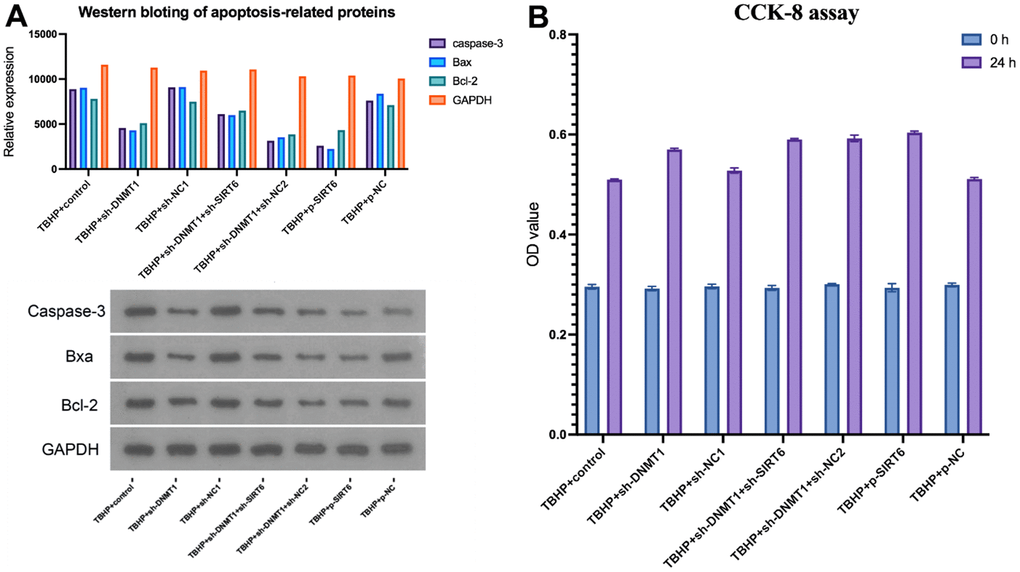 The CCK-8 assay was used to evaluate NPCs’ proliferation and survival. After transfection, the TBHP + sh-DNMT1 + sh-NC2, TBHP + p-SIRT6, and TBHP + sh-DNMT1 groups showed significantly higher viability rates than the control groups (p<0.05) (Figure 6B). CCK-8 assay results revealed that interference with SIRT6 and sh-DNMT1 promoted the proliferation of NPCs (p<0.05).