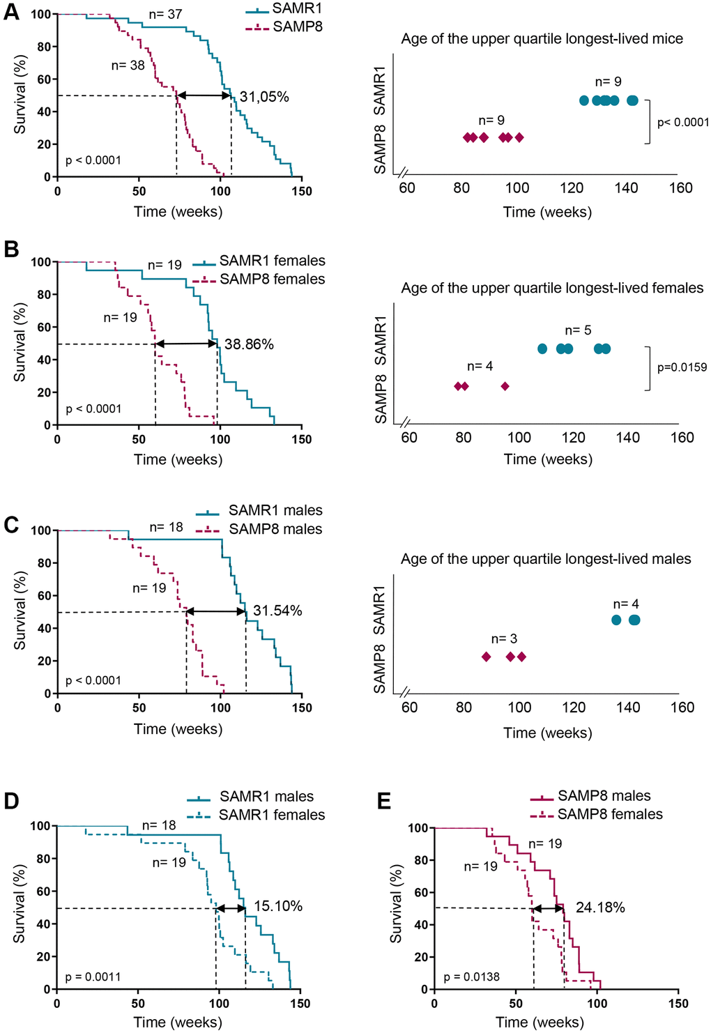 The lifespan of the SAMP8 mice is shorter than that of the SAMR1 mice [52]. In order to validate the lifespan of SAMP8 and SAMR1 in our housing conditions and to analyze the survival of SAMP8 and SAMR1 females, which has not been shown, we monitored 38 SAMP8 mice and 37 SAMR1 mice under free-intervention conditions. The age of death of mice involved in survival analysis is shown in Supplementary Table 1. Pathologies found after necropsy analysis in the SAMP8 and SAMR1 mice are shown in Supplementary Figures 1 and 2 and described in Supplementary Table 2. SAMP8 presented a 31.05 % shortened median lifespan (p < 0.0001) compared to SAMR1 (Table 1 and Figure 1A). Next, we considered males and females separately, to further discern differences in survival distributions of both models. SAMP8 females showed a decreased median lifespan (Table 1 and Figure 1B, left panel) compared to gender-matched controls (60 weeks in SAMP8 vs. 98.14 weeks in SAMR1), reaching a difference of 38.86% (p < 0.0001). The ages of death of the upper-longevity quartile were also statistically significantly decreased in SAMP8 compared to SAMR1 females (Figure 1B, right panel; p = 0.015). Similarly, SAMP8 males had shorter median lifespan (31.54%; p < 0.0001) compared to SAMR1 males (Table 1 and Figure 1C). Comparisons of female and male survival (Table 1 and Figure 1D and 1E) showed that in both SAMR1 and SAMP8 models, females presented a shortened median lifespan compared to males (24.18% in SAMP8 model vs. 15.10% in SAMR1 model). Together our results show that SAMP8 females have the shortest median and maximum survival among the different groups analyzed.