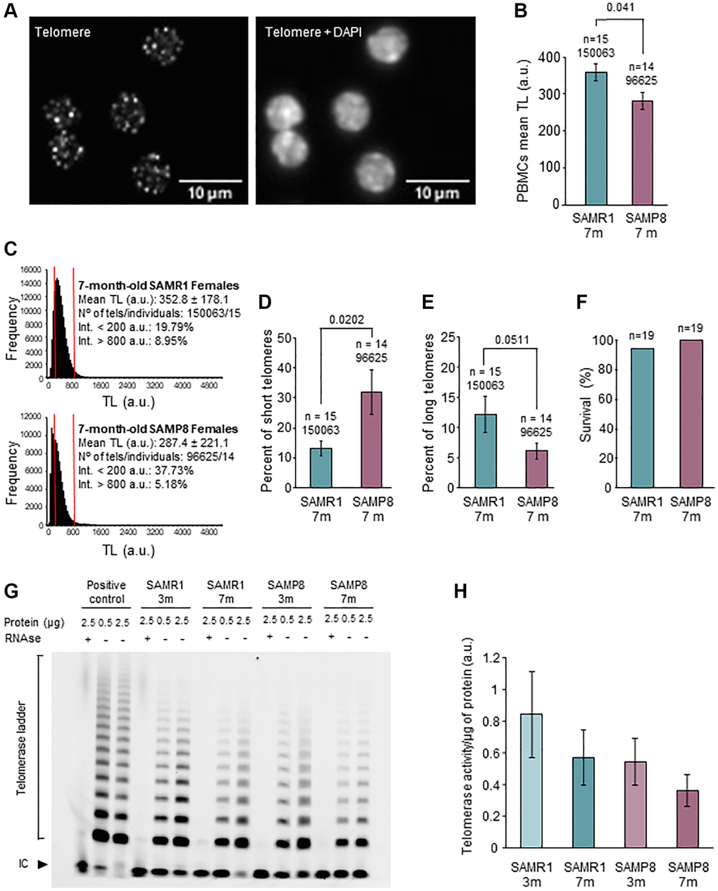 In this work, we have found, a robust phenotype, in terms of reduced lifespan, in SAMP8 females. Interestingly, at the age of 7 months, when survival was similar in both groups, TL in PBMCs was shorter and TA was decreased in SAMP8 females compared to age-matched SAMR1 female mice. In addition, in the middle-aged (7-month-old) SAMP8 females, TA, telomerase expression and the accumulation of longer telomeres in the ovaries were reduced. These changes coincided with impaired reproductive function in SAMP8 mice, with decreased number of collected oocytes after OS and higher percentage of morphologically abnormal embryos.