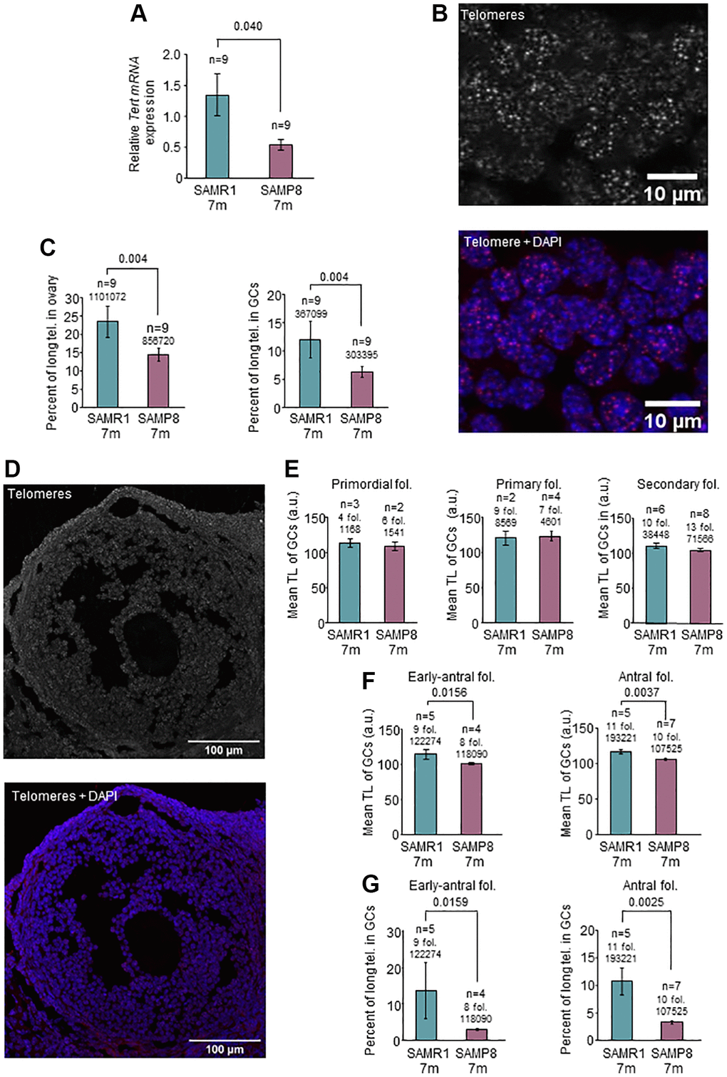 SAMP8 females have reproductive senescence at the age of 7 months [43], coinciding with systemic alterations in blood TL. Several lines of evidence point to an association between telomere alterations and fertility disorders [34, 55, 56]. Thus, we investigated telomere pathway in the ovary. We first explored TA by TRAP assay and found lower levels in SAMP8 females at the age of 7 months (Figure 2G and 2H) compared to age-matched SAMR1 and young females. Comparing both models at the age of 7 months, 73.33% of SAMP8 females showed lower TA levels in ovarian samples (n = 15). We then measured the levels of Tert expression, which correlate with TA [58]. In the ovaries of 7-month-old SAMP8 females, Tert expression was statistically significantly lower compared to SAMR1 females (0.543 in SAMP8 vs. 1.348 in SAMR1, p = 0.040) (Figure 3A). In order to determine if lower Tert expression would have an impact on telomere maintenance, TL in ovaries was measured (Figure 3B). Statistically significant differences were not found in mean TL either globally or in GCs (Supplementary Figure 4, Table 2). However, 7-month-old SAMP8 females presented a statistically significantly lower percentage of long telomeres (Figure 3C, Table 2) in both global ovarian tissue (6.65 in SAMP8 vs. 11.11% in SAMR1, p = 0.04) and GCs (6.23% in SAMP8 vs. 11.92% in SAMR1, p = 0.04). Although higher percentages of short telomeres were systematically found in SAMP8 samples, they did not reach statistical significance (Table 2). Given that GCs intensely proliferate during folliculogenesis, we analyzed separately GCs from each follicular stage (Figure 3D). Mean TL of GCs in primordial, primary and secondary follicles, was not different in SAMP8 and SAMR1 ovaries (Figure 3E, Table 2). Interestingly, mean TL was statistically significantly decreased in 7-month-old SAMP8 females in GCs from early-antral (100.8 a.u. in SAMP8 vs. 114.0 a.u. in SAMR1, p = 0.0159) and antral follicles (105.9 a.u. in SAMP8 vs. 116.7 a.u. in SAMR1, p = 0.0037) compared to age-matched controls (Figure 3F, Table 2). In SAMP8 females (Figure 3G, Table 2), lower accumulation of long telomeres was found in early-antral (3.03% in SAMP8 vs. 13.66% in SAMR1, p = 0.0159) and antral follicles (3.36% in SAMP8 vs. 10.73% in SAMR1, p = 0.0025). An increased percentage of critically short telomeres (Table 2) was also found in antral follicles of SAMP8 females (28.78% in SAMP8 vs. 11.31% in SAMR1, p = 0.0225). Our results suggest that lower Tert expression levels and TA may impact TL of GCs in developing follicles.