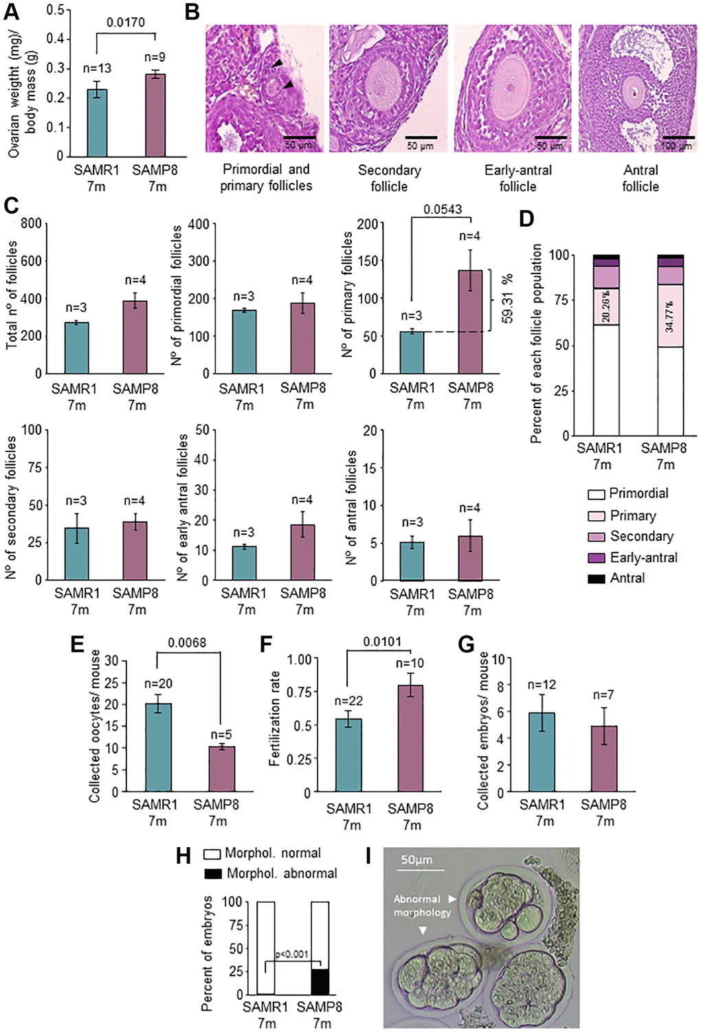 In telomerase-deficient mice organ function is impaired [19]. Since SAMP8 had lower TA and Tert levels in the ovary and lower mean TL in early-antral follicles, we tested ovarian function. Ovarian weight normalized by body mass of SAMP8 females was higher than controls (Figure 4A; p = 0.017), accompanied by the presence of numerous corpus luteum, found in histopathological analysis (Supplementary Figure 5). Despite the higher ovarian weight, there were not differences in absolute numbers of either total follicles or in the different follicular stages (Figure 4B and 4C). Mean number of primary follicles was higher in SAMP8 females (59.31%), although it did not reach statistical significance (Figure 4C). This was also observed when follicular stages were represented as percentages (34.77% in SAMP8 vs. 20.26% in SAMR1; p = 0.0567) (Figure 4D). Premature ovarian aging is reflected in the gamete production and fertility [3]. Therefore, we analyzed the number of oocytes collected (Figure 4E) after ovarian stimulation (OS), finding that 7-month-old SAMP8 females produced significantly lower number of oocytes (p = 0.0068). Fertilization rate was not impaired in SAMP8 females (Figure 4F) and the number of collected embryos were not different between the groups (Figure 4G). However, the percentage of morphologically abnormal embryos was significantly higher in SAMP8 females (27.03% in SAMP8 vs. 1.22% in SAMR1; p < 0.001; Figure 4H and 4I). Our results suggest that oogenesis and embryo development is impaired in 7-month-old SAMP8 mice compared to age-matched controls, coinciding with alterations in the telomere pathway.