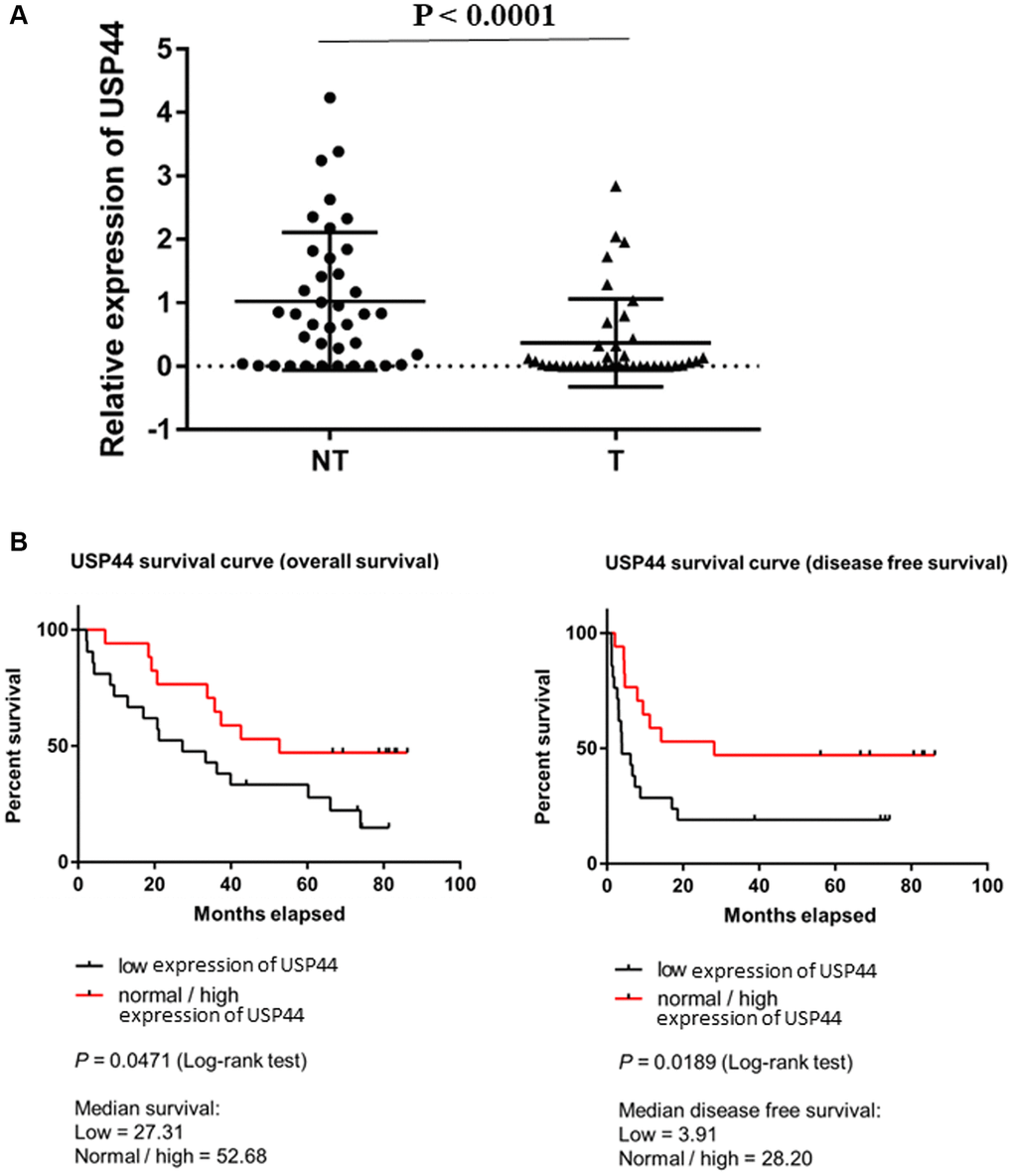 We began by examining USP44 expression in human HCC by analyzing 40 HCC tumors (T) and paired adjacent nontumoral liver tissue (NT). The quantitative RT-PCR results demonstrated significant downregulation of USP44 in HCC tumors (57.5%) compared with adjacent nonmalignant liver tissue (p < 0.0001, Figure 1A), indicating that USP44 is commonly reduced in HCC. We next conducted a correlative analysis of the USP44 expression in HCC tumors and the clinicopathologic features of the patients. The results showed that expression of USP44 was lower in advanced-stage (stages IV) than in early-stage (stages II and III) HCC tumors (p = 0.049, Table 1), suggesting that USP44 expression is related to tumor staging. In addition, overall survival (p = 0.0471) and disease-free survival (p = 0.0189) were significantly poorer in the low USP44 expression group (median overall survival: 27.31 months; median disease-free survival: 3.98 months) than in the normal and high USP44 expression groups (median overall survival: 52.68 months; median disease-free survival: 28.2 months; Figure 1B). Taken together, our results indicate that low USP44 expression is a prognostic factor in HCC.