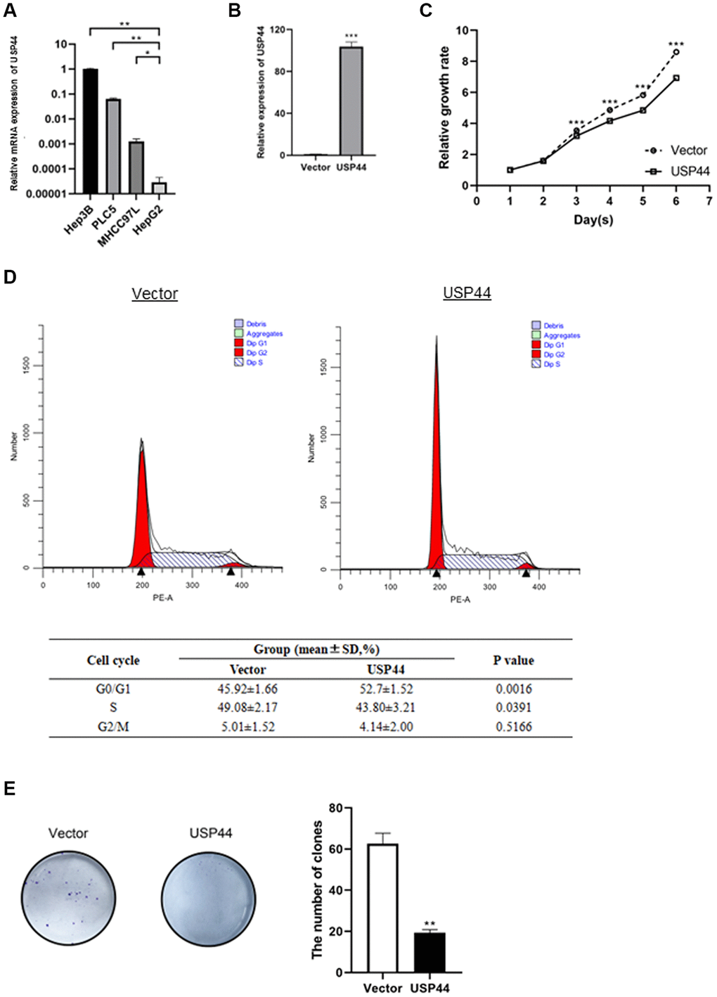 In a gain-of-function study, we used an HCC cell line model to determine the role of USP44 in the carcinogenicity of HCC. The HCC cell line HepG2 has relatively low USP44 mRNA expression as compared to other HCC cell lines including Hep3B, PLC-5, and MHCC97L (Figure 2A). Overexpression of USP44 in HepG2 cells was validated at the gene levels by quantitative RT-PCR (Figure 2B). We next investigated the functional role of USP44 in HCC. Our results showed that the overexpression of USP44 could significantly inhibit the growth of HCC cells (Figure 2C) and arrest the cell cycle at the G0/G1 phase (Figure 2D). In addition, USP44 overexpression reduced the ability of HCC cells to form colonies (Figure 2E). Collectively, these data suggest the importance of USP44 in HCC tumorigenicity.