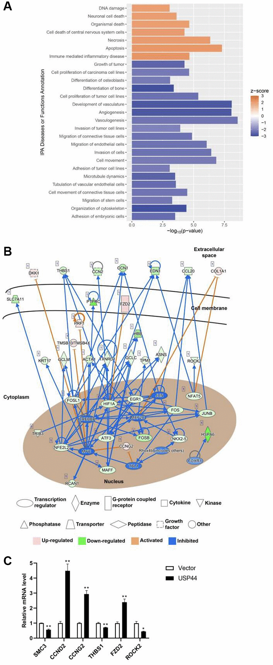 Statistical analyses of patient information, including age, sex, expression level of AFP, and the staging of HCC were performed using the Pearson chi-squared test. The positive of HBsAg in HCC, number of tumor nodules, degrees of differentiation, venous infiltration, and the presence of cirrhosis in HCC were performed using the Fisher's exact test. Size of largest tumor-length was assessed by the Student's t-test. The SPSS-PASW Statistics 18 software was used for statistical analyses. Correlations between clinicopathologic characteristics and USP44 expression levels were assessed by the Student’s t-test to establish differential gene expression in relation to specific tumor phenotypes. Quantitative data are reported as means with standard deviation or standard error of the mean. The Wilcoxon matched-pairs signed rank test was used to compare USP44 expression levels between groups. Patient survival was calculated using the Kaplan–Meier method from the date of surgery to the date of death or last follow-up. The log-rank test was used to compare survival between the groups. The Z-score is determined by using the Ingenuity Pathway Analysis. The DEGs of each treatment group were uploaded to the IPA system for functional analysis (Qiagen, Hilden, Germany). Canonical Pathway Analysis of IPA was used to identify significantly enriched canonical pathways in each treatment group, and Diseases and Functions Analysis of IPA was used to identify significantly enriched diseases and biological functions in each treatment group. The pathway or function with P-value < 0.05 was considered statistically significant. The activation z-score is to infer the activation states of predicted transcriptional regulators. The activation state of an upstream regulator is determined by the regulation direction associated with the relationship from the regulator to the gene.