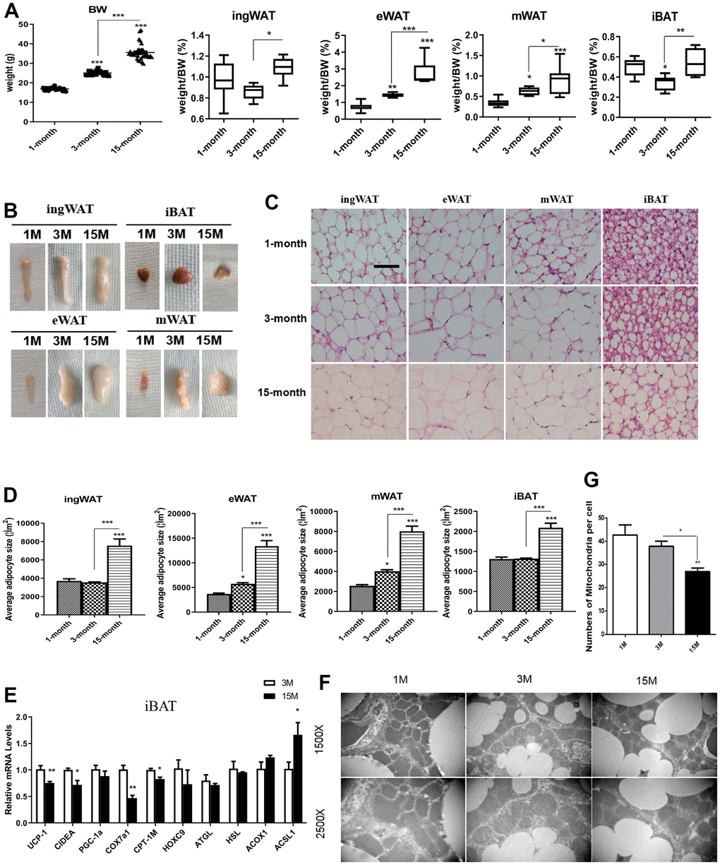 As shown in Figure 1A, the bodyweight of mice of different age groups was different. Among the three groups, the bodyweight of middle-aged transitional mice group was the highest. We measured adipose tissue weight from the four different depots of ad libitum (AL)-fed mice against the total body weight, and found the weight of the fat depots in late-middle aged mice to be the highest (Figure 1B). There was a noticeable increase in both the size and percent weight of visceral fat, particularly epididymal WAT (eWAT) with increasing age. Compared with the adolescent group, the weight of the inguinal WAT (ingWAT) and interscapular BAT (iBAT) from adult mice were both decreased slightly, but the proportion of ingWAT and iBAT in the middle-aged transitional mice were higher than that in the other groups. The proportion of ingWAT (1%) was the highest among all the other types of adipose tissues in adolescent mice, while the proportion of eWAT increased with age, from 0.71% in the adolescent group to 2.75% in middle-aged transitional group.