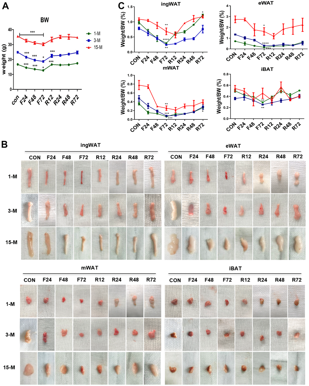 Four adipose depots were collected from all the animals at each time point (Figure 2B). Compared to the control group, F72 h fasting promoted a greater loss of BATR in the young (83.11%), adult (75.66%) and the middle-aged transitional mice (40.91%), respectively. Moreover, compared to the control group, after R72 h, the total body white adipose tissues ratio (BWATR) of the three groups was significantly reduced by 29.86%, 38.74% and 11.63%, respectively.