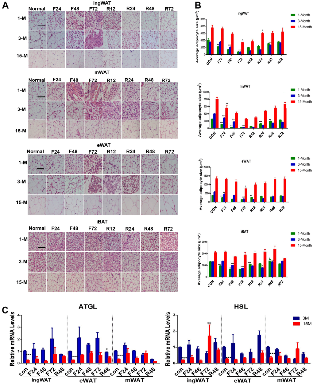 Analyzing the average area of adipocytes (Figure 3B) also showed that adipocyte size of mWAT from the three groups was the first to decrease after F24 h (by 50% in young mice, 25% in adult mice, and 25% in the middle-age transitional mice), whereas that of eWAT and sWAT remained unchanged or modestly reduced after F48 h. After F72 h, adipocyte size in mWAT decreased by 99%, 99%, and 60%, in the young, adult and middle-age transitional mice, respectively. The eWAT was reduced by 60%, 75%, and 20%, and the ingWAT by 80%, 85%, and 30% in young, adult and middle-age transitional mice, respectively.