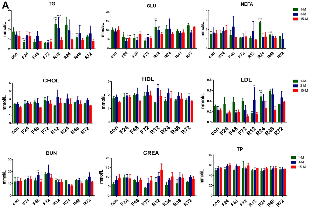 After F24 h, the serum levels of GLU and TG were significantly reduced in all the three groups of mice. Upon 72 h fasting, this change became insignificant. After feeding for another 12 hours, the serum levels of GLU and TG of the adolescent and adult groups rose rapidly. Although there was a slight upward trend in the middle-age transitional group, it was not statistically significant. The NEFA levels of all the three groups of mice tended to increase after 24 h fasting. The NEFA levels of the adult group continued to increase until fasting for 48 h. Subsequently, the NEFA of the three groups of mice decreased. After refeeding, the NEFA levels of the adolescent and adult groups increased rapidly, but that of the middle-age transitional mice did not.
