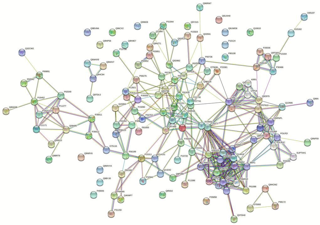 To gain a deeper comprehension from the perspective of the biological context of differentially expressed proteins, the protein interaction analysis was conducted by utilizing the free web-based search tool STRING10.5. The STRING database is a fundamental data resource within the ELIXIR’s core, containing both identified and anticipated protein interactions. These data will be collected and integrated by the STRING database, with consolidating identified and anticipated protein-protein correlation data for the organism’s large number [11]. STRING was needed to incorporate additional predicted functional partners for the purpose of improving the PPI networks formation. The protein IDs list that was differentially expressed was entered into the STRING database (https://string-db.org) to determine identified and anticipated protein functional correlation networks.