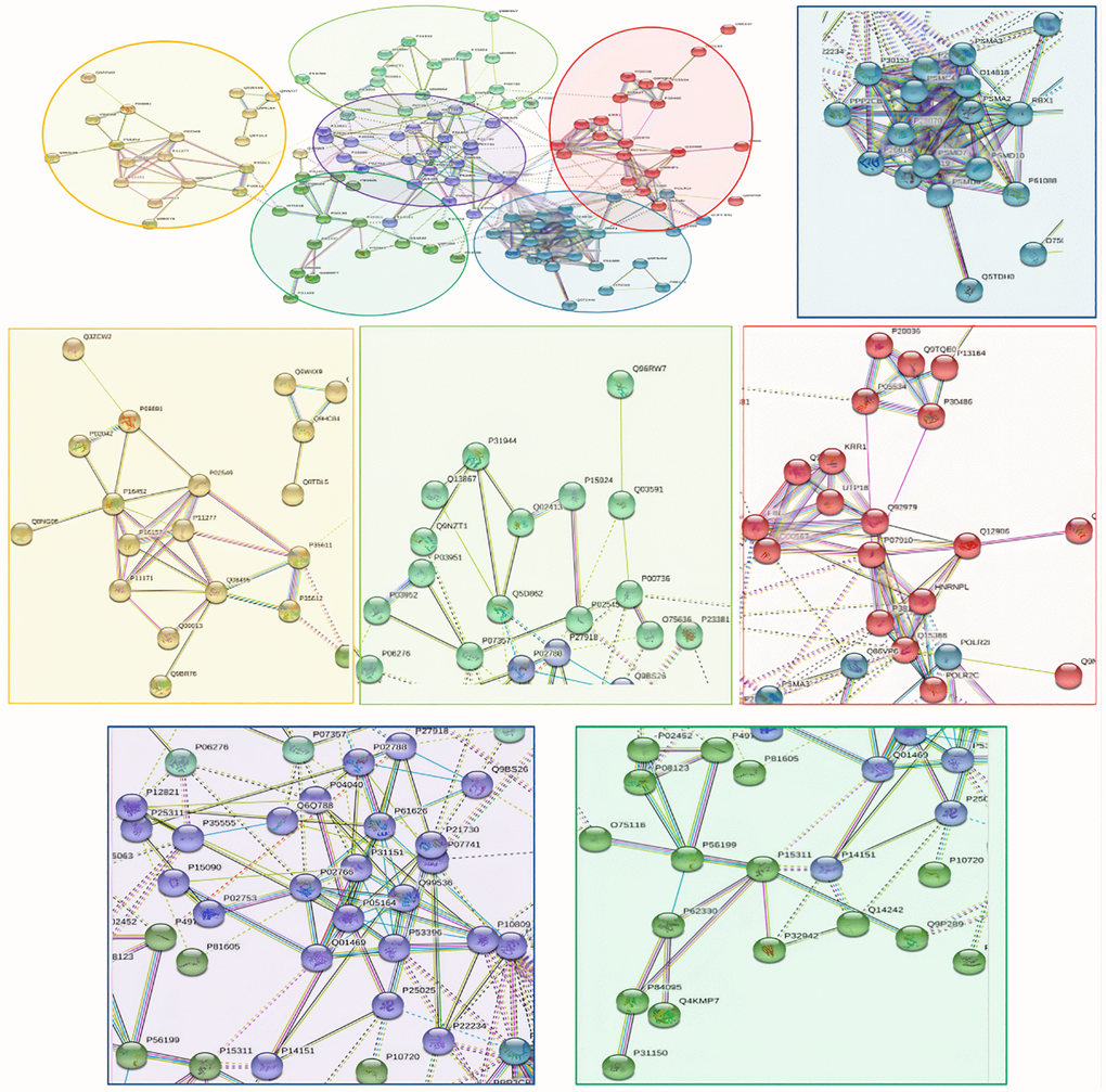 118 down-regulated proteins were suitable for PPI network analysis (focus molecule) and a controlled PPI networks with high-quality were constructed according to the STRING database. A complete regulation of PPI network by down-regulated proteins were presented in Figure 10. The network clustering result showed that the PPI network consists of six specified function clusters that comprise proteins with similar functions and are expressed by various colors (Figure 11). These six visualized interaction function clusters (sub-networks) were related to protein localization to juxtaparanode region of axon (yellow), cell adhesive protein binding, Fibrin Clot formation (green), mRNA splicing and RNA recognition (red), complement activation, lipid metabolism (purple), protein trafficking and cytoskeleton remodeling (lime green), and ATP-dependent degradation of ubiquitinated proteins (blue), respectively. The anticipated functional intermediate partners in the PPI network are presented in Table 8.