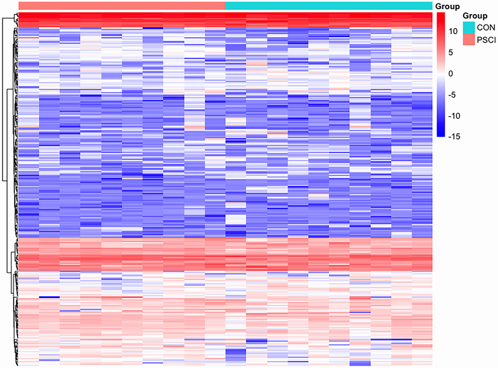 In total, 259 differentially expressed exosome proteins have been measured and determined between the control group and PSCI group by Label-free quantitative proteomics, of which 131 proteins demonstrated up-regulated expression and 128 proteins showed down-regulated expression. The differentially expressed proteins with PSCI/control ratios that are high or less than 1.2-fold change having a set P-value < 0.05 were shown to be significantly changed. The differentially expressed proteins volcano plot was presented in Figure 2. The heat map of the whole differential expressed proteins were presented in Figure 3. The identification results of main 30 up-regulated proteins were presented in Table 3 and the other 101 up-regulated proteins were shown in Supplementary Table 1. The identification results of main 30 down-regulated proteins were shown in Table 4 and the other 98 down-regulated proteins were shown in Supplementary Table 2. The results of these proteins are summarized in detail. According to Table 5, the biological process category of 30 up-regulated proteins and molecular function were conducted according to biological function. The biological process category of 27 down-regulated proteins and molecular function were shown in Table 6.