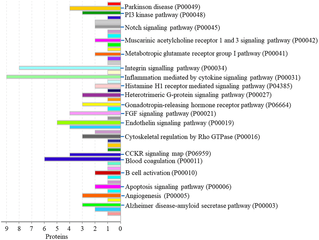 Protein classification results indicated that 7.0%, 5.5%, 4.7%, 4.7%, 5.5%, 3.9% and 4.7% of these 128 up-regulated proteins were cytoskeletal protein, membrane traffic protein, metabolite interconversion enzyme, protein modifying enzyme, protein-binding activity modulator, scaffold/adaptor protein, and transporter, respectively (Figure 4A). Molecular function classification results indicated that 26.6%, 17.2%, 4.7% of these 128 up-regulated proteins were binding, catalytic activity, and transporter activity, respectively (Figure 4B). In biological process classification, the majority of the proteins were identified to be contributed in biological regulation (28.1%), organization of cellular component or biogenesis (18.0%), cellular process (39.8%), localization (18.8%), metabolic process (15.6%), response to stimulus (21.9%), and signaling (16.4%), respectively (Figure 4C). Based on the categorization of pathways, most of these proteins were associated with blood coagulation (4.8%), CCKR signaling map (3.1%), EGF receptor signaling pathway (3.1%), endothelin signaling pathway (3.9%), FGF signaling pathway (3.1%), inflammation induced by chemokine and cytokine signaling pathway (7.0%), integrin signaling pathway (6.3%), PI3 kinase pathway (2.3%) (Figure 5). The blood coagulation pathway included proteinase-activated receptor 4, platelet glycoprotein V, integrin alpha-IIb, platelet glycoprotein Ib alpha chain, platelet glycoprotein Ib beta chain, and platelet glycoprotein IX. The endothelin signaling pathway included endothelin-converting enzyme 1, cAMP-dependent protein kinase catalytic subunit beta, protein kinase C beta type, mitogen-activated protein kinase 1, and guanine nucleotide-binding protein subunit alpha-14.