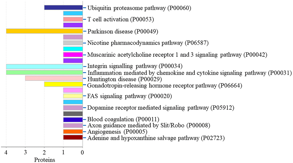 Protein classification results indicated that 5.9%, 5.9%, 8.5%, 3.4%, 10.2% and 4.2% of these 118 down-regulated proteins were cytoskeletal protein, extracellular matrix protein, metabolite interconversion enzyme, nucleic acid binding protein, protein modifying enzyme, and protein-binding activity modulator, respectively (Figure 6A). Molecular function classification results indicated that 28.2%, 24.8%, 5.1%, 2.6% and 5.1% of these down-regulated proteins were binding, catalytic activity, molecular function regulator, molecular transducer activity and transporter activity, respectively (Figure 6B). Throughout the biological process classification, the majority of the proteins were identified to be contributed in biological regulation (20.3%), cellular composition organization or biogenesis (18.6%), cellular process (39.0%), immune system process (6.8%), localization (13.6%), metabolic process (21.2%), multicellular organismal process (9.3%), response to stimulus (16.1%) and signaling (9.3%) (Figure 6C). Based on the categorization of pathways, most of these proteins were connected to gonadotropin-releasing hormone receptor pathway (1.7%) and ubiquitin proteasome pathway (1.7%) (Figure 7). The chemokine and cytokine signaling pathway which induced the inflammation included rho-related GTP-binding protein, platelet factor 4 variant, C5a anaphylatoxin chemotactic receptor 1, and C-X-C chemokine receptor type 2. The integrin signaling pathway included collagen alpha-1(I) chain, collagen alpha-2(I) chain, integrin alpha-1, and ADP-ribosylation factor 6.
