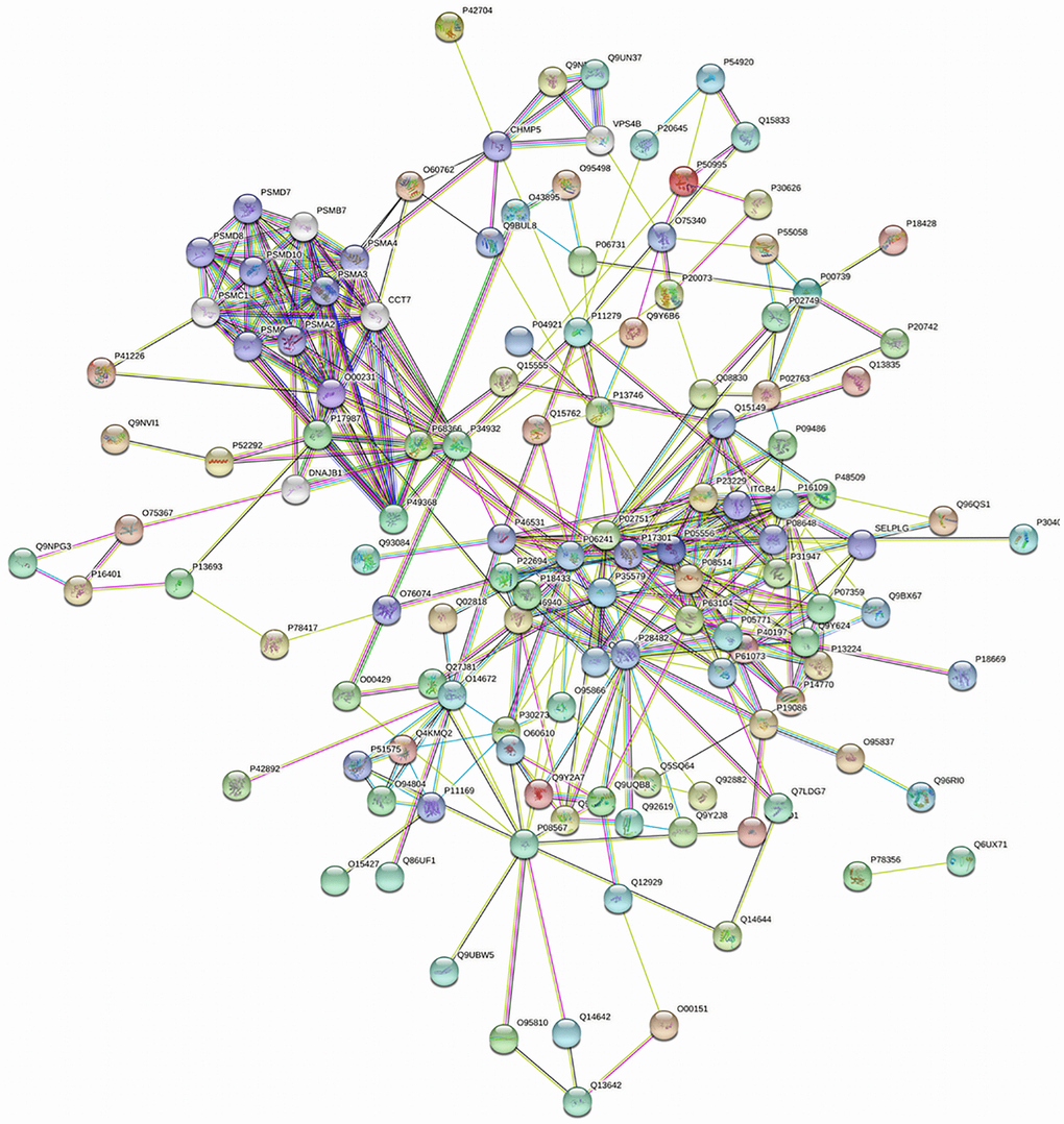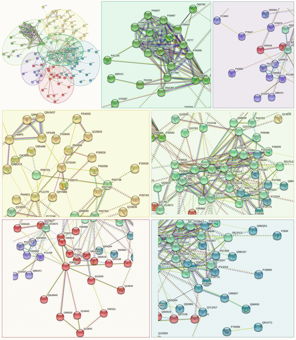 Utilizing STRING analysis, a controlled PPI network with high-quality was constructed. 127 up-regulated proteins were suitable for PPI network analysis (focus molecule) and PPI networks with high-quality were built according to the STRING database. A complete PPI regulation network with 127 up-regulated proteins were presented in Figure 8. The network clustering results showed that the PPI network consists of six specified function clusters that comprise proteins with similar functions and are expressed by various colors (Figure 9). These six visualized interaction function clusters (sub-networks) were related to degradation of ubiquitinated proteins and folding of proteins (lime green), calcium-dependent protein binding and ESCRT III complex disassembly (yellow), cytoskeleton reorganization and platelet aggregation (green), phospholipid scrambling of phosphatidylserine in platelets and ATP mediates synaptic transmission (purple), lipid binding, signal transduction (red), and blood coagulation, intrinsic pathway (blue), respectively. The PPI network which included the anticipated functional intermediate partners are presented in Table 7.