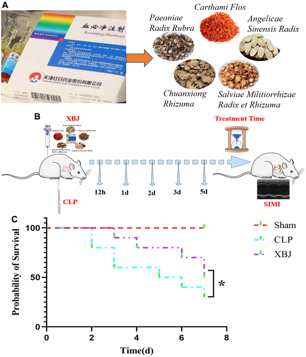 The ingredients in XBJ, a Chinese patent medicine approved for the treatment of sepsis and multi-organ dysfunction in China in 2004, include Carthamus tinctorius L. (Carthami Flos, hong hua), Paeonia lactiflora Pall. (Paeoniae Radix Rubra, chi shao), Ligusticum chuanxiong Hort. (Chuanxiong Rhizoma, chuan xiong), Salvia miltiorrhiza Bge. (Salviae Miltiorrhizae Radix Et Rhizoma, dan shen) and Angelica sinensis (Oliv.) Diels (Angelicae Sinensis Radix, dang gui) (Figure 1A) [7]. XBJ acts in both the early and late stages of sepsis by anti-inflammatory, anti-coagulation, immune regulation, vascular endothelial protection, anti-oxidative stress and other mechanisms [8]. A key response protein target coverage of 90.16% was found in the target association pattern of the phytoconstituents of XBJ with the causative genes of sepsis, demonstrating the dominancy of XBJ in the treatment of sepsis [9]. However, the underlying therapeutic mechanisms of XBJ on sepsis are still unknown, the specific mechanisms of XBJ in SIMI need to be further investigated.