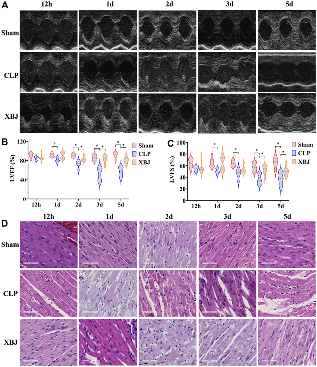 Rats in the CLP group had dilated hearts, as seen on the echocardiographic images, as opposed to rats in the Sham and XBJ group (Figure 2A). According to Echocardiographic findings, up to 12 hours after CLP induction, the decline in cardiac function in septic rats was not statistically significant (p > 0.05) in both the LVEF and LVFS in the CLP group; while there was a significant decrease, which started 1d after CLP (p < 0.05). In septic rats, XBJ significantly enhanced LVEF at 2d, 3d, 5d, and LVFS at 3d, 5d (p <0.05); however, XBJ’s effect on LVEF at 12h, 1d, and LVFS at 12d, 1d, 2d was not statistically significant (p > 0.05, Figure 2B, 2C). Overall, the levels of LVEF, and LVFS dropped in the CLP group while the levels of LVEF, and LVFS increased in the XBJ group in a time-dependent way.