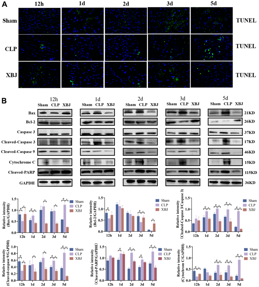 We measured the expression of the proteins Bax, Bcl-2, Cleaved-Caspase 3, Cleaved-Caspase 9, Cytochrome C, and Cleaved-PARP by western blot and the apoptotic state by TUNEL staining in the myocardium of different groups over the course of five time points (12h, 1d, 2d, 3d and 5d) to explore the effect of XBJ on cardiomyocyte apoptosis during sepsis. We used TUNEL staining (Figure 4A) to observe that the CLP group’s cardiomyocyte apoptosis was clearly apparent when compared to the myocardial structure of the Sham group at the same point of time. Similarly, as the septic rats’ exposure to CLP was prolonged, the extent of their cardiomyocyte apoptosis grew progressively more severe.