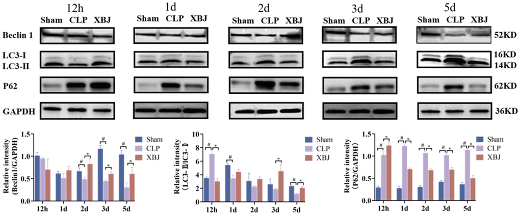 Autophagosome development is marked by the protein LC3, and the ratio of LC3 II to LC3 I indicates how many autophagosomes are active (positive correlation). Beclin-1 and LC3-II play the vital role to the promotion of autophagy. On the contrary, P62 is regarded as a negative regulator of autophagic activity. To explore the effect of XBJ on cardiomyocyte autophagy during sepsis, we measured LC3-II/LC3-I ratio and the expression of the proteins Beclin-1 and P62 by western blot in the myocardium of different groups over the course of five time points (12h, 1d, 2d, 3d and 5d). As shown in Figure 5, the expression of the protein Beclin-1(except for 12h) and LC3-II/LC3-I ratio (except for 12h) were significantly decreased, whereas the expression of P62 was significantly increased in the CLP group as compared with the Sham group at the same point of time. However, treatment with XBJ significantly augmented the expression level of the protein Beclin-1 (except for 12h) and LC3-II/LC3-I ratio (except for 12h), as well as reduced the expression of P62 (except for 12h) in the myocardium as compared with the CLP group. These results revealed that XBJ alleviated SIMI by inhibiting autophagy in the early stage of sepsis, and enhancing autophagy in the late stage of sepsis.