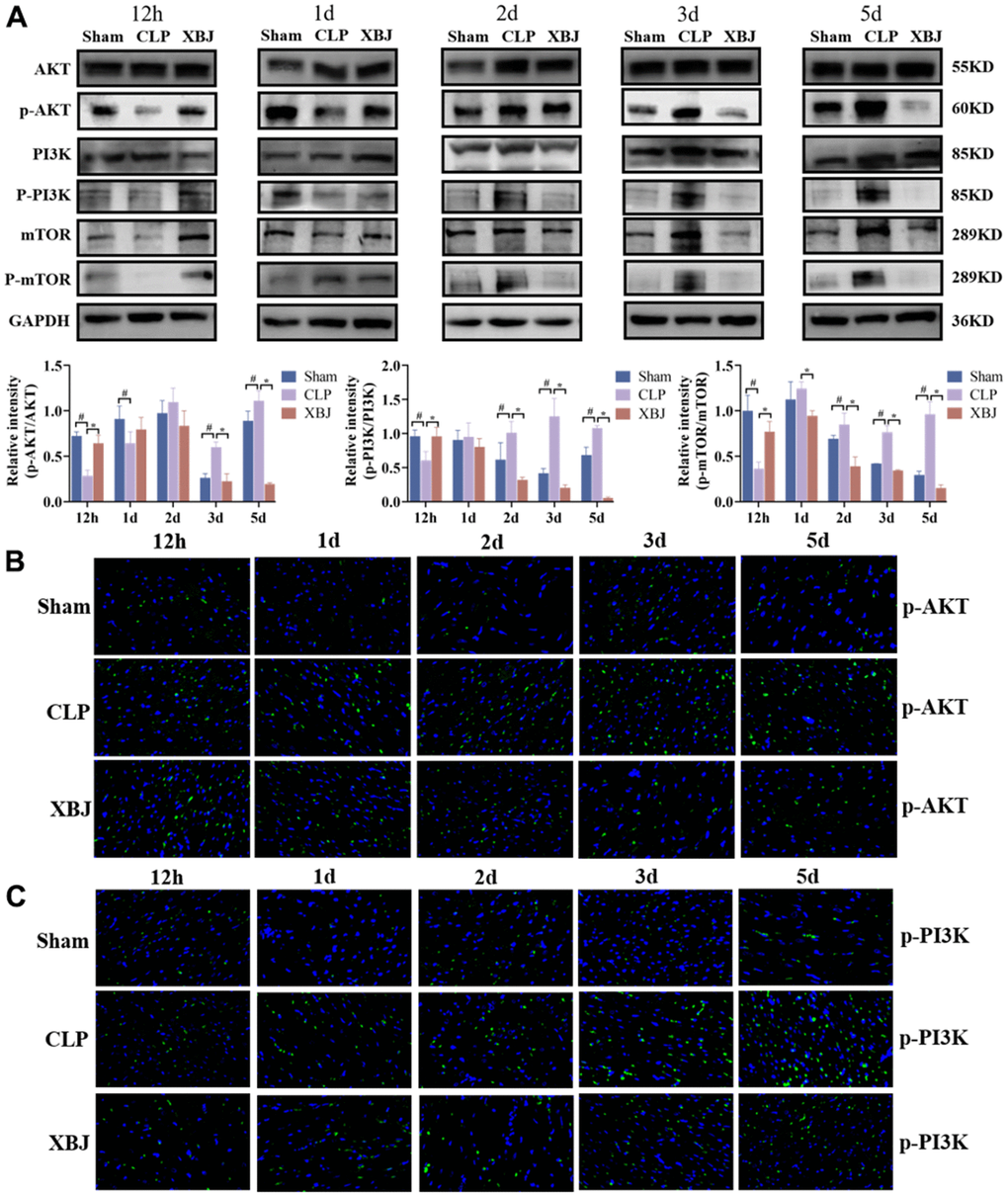 The results of the immunofluorescence assay also demonstrated that the expression of the proteins p-AKT (Figure 6B) and p-PI3K (Figure 6C) were upregulated in the CLP group at the same time as compared to the Sham group, whereas it was downregulated in the XBJ group as compared to the CLP group at the same time. These findings suggested that XBJ can safeguard the myocardium in septic rats by activating the PI3K/AKT /mTOR signaling pathway in the early stages of sepsis and inhibiting it in the latter stages.