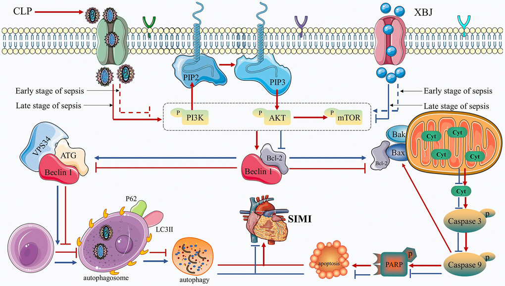 In this study, a septic rat model was created using CLP, the rats were then given XBJ intraperitoneally, and a series of laboratory tests was conducted. The aim here is to find out how XBJ regulates autophagy and apoptosis mediated by PI3K/AKT/mTOR signaling pathway to enhance SIMI.