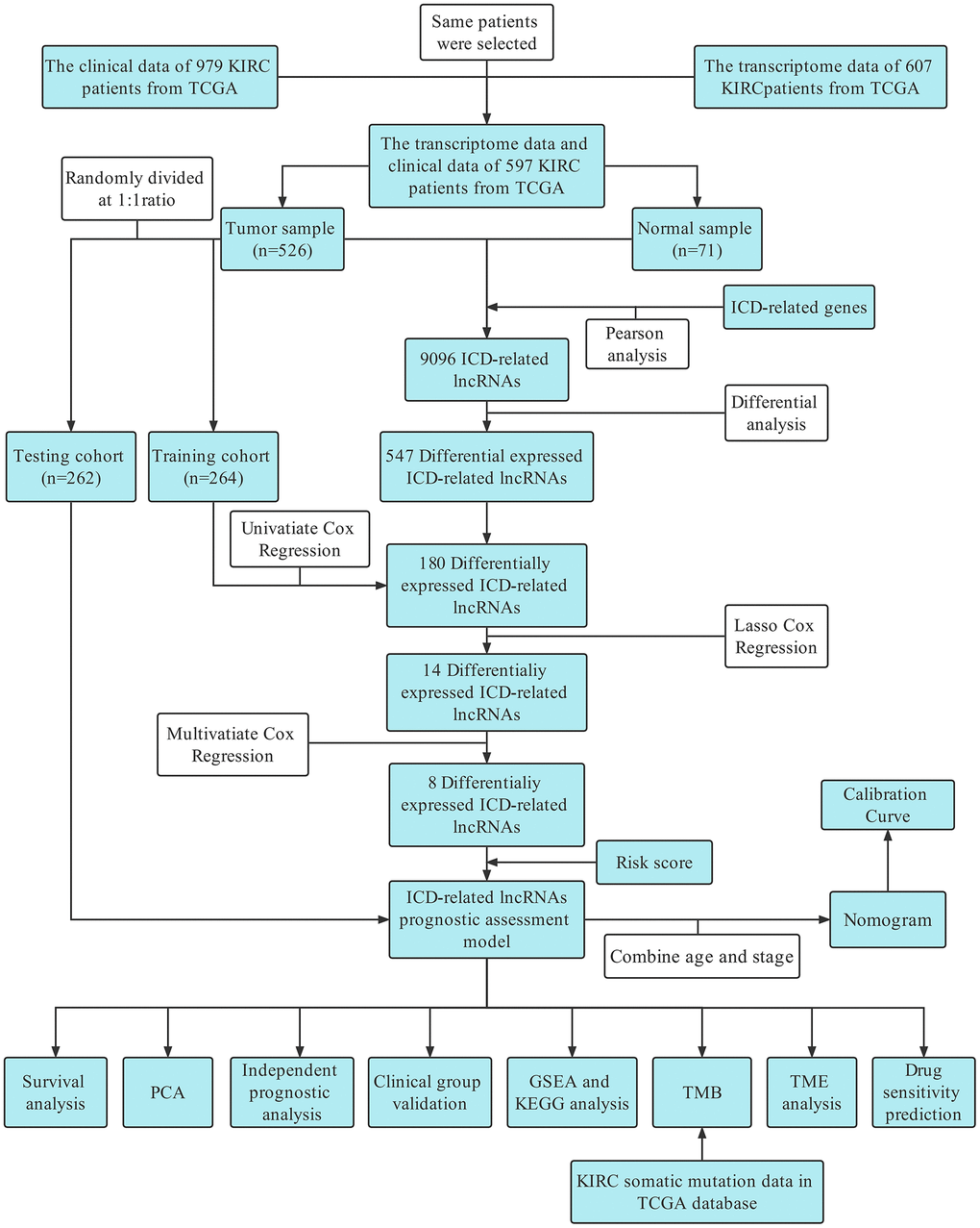Immunogenic cell death (ICD), one of the important modalities of regulatory cell death, promotes antitumor effects by triggering the activation of cytotoxic T cells [5]. Simultaneously, long noncoding RNAs (lncRNAs) are indispensable for performing this function, and lncRNA-related models have been successfully constructed for numerous cancer types. lncRNA models constructed by Liu Z et al. were validated in the prognostic assessment of colorectal cancer patients [6]. lncRNA contributions in tumor therapy were reviewed by Eptaminitaki GC et al. [7]. Liang YL et al. constructed a tumor immune heterogeneity-associated lncRNA prognostic model to determine the long-term prognosis of patients with nasopharyngeal carcinoma [8]. However, a KIRC prognostic assessment model based on ICD-related lncRNAs is still not available.