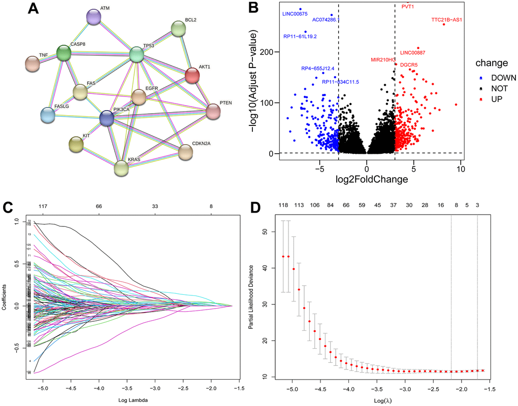 The overall study design of this paper is displayed in a flow chart (Figure 1). First, we identified ICD-related genes and constructed a protein–protein interaction (PPI) network associated with 16 of these genes by using the STRING website (Figure 2A). Further Pearson correlation analysis was executed, from which we derived 9096 ICD-associated lncRNAs. Next, we narrowed the pool down to 547 lncRNAs that were shown by differential analysis to be differentially expressed in tumor tissues (Figure 2B).