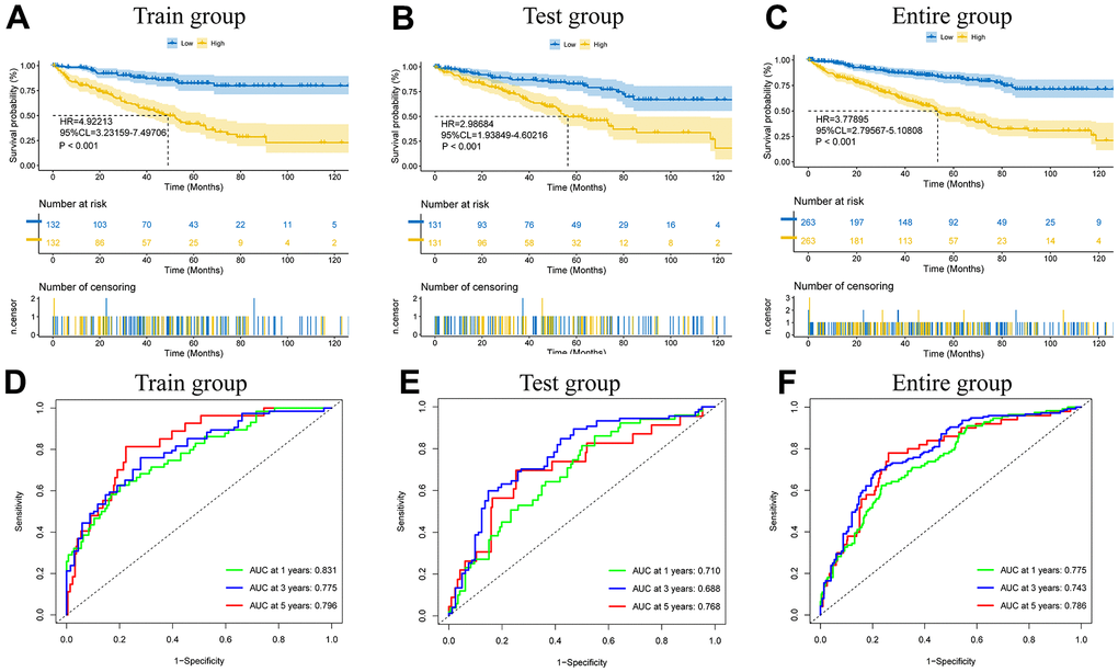 We used the results from predictive model building. The format of the risk score was as follows: risk score = coefficient (lncRNA1) × expression (lncRNA1) + coefficient (lncRNA2) × expression (lncRNA2) + coefficient (lncRNA3) × expression (lncRNA3) +......+ coefficient (lncRNAn) × expression (lncRNAn). Using the midpoint of the risk score as its threshold, the training group, the test group and all patients were sorted into high- and low-risk cohorts for survival analysis. Kaplan-Meier (K-M) survival analysis utilizing “survival” and “survminer” was conducted to examine the variation in overall survival (OS) between risk categories in the training cohort, test cohort, and total cohort. Receiver operating characteristic (ROC) values at one, three, and five years were extrapolated to evaluate the predictive performance of the signature.