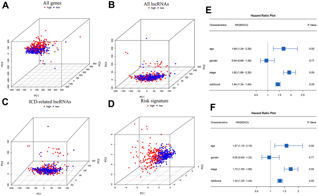 Principal component analysis (PCA) using the expression profiles of all genes, all lncRNAs, lncRNAs associated with ICD, and lncRNAs in the selected prognostic models was conducted to validate the subgrouping effect. In addition, univariate and multifactor Cox independent prognostic analyses were conducted to assess risk scores and clinical data to validate the predictive value of the risk model. After that, K-M survival analysis was conducted to probe the model feasibility under dissimilar clinical characteristics.