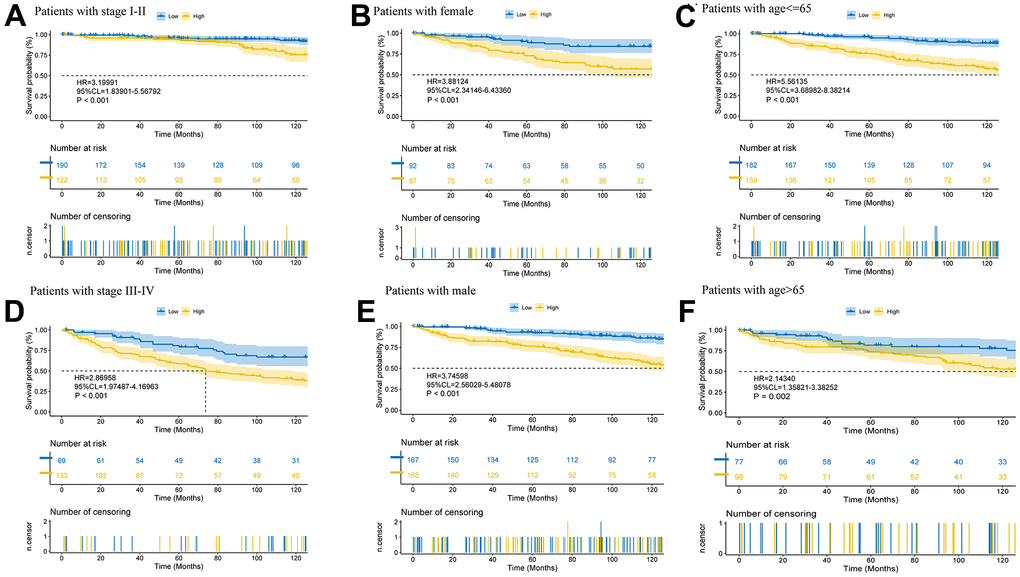 The expression heatmap containing different clinical data, risk groupings, and prognostic model-related lncRNAs (Supplementary Figure 3A) and the survival curves of patients in a variety of clinical states (Figure 5) illustrate the significance of the model predictions (stage I-II: p<0.001, stage III-IV: p<0.001; female: p<0.001, male: p<0.001; age<=65: p<0.001, age>65: p=0.002).