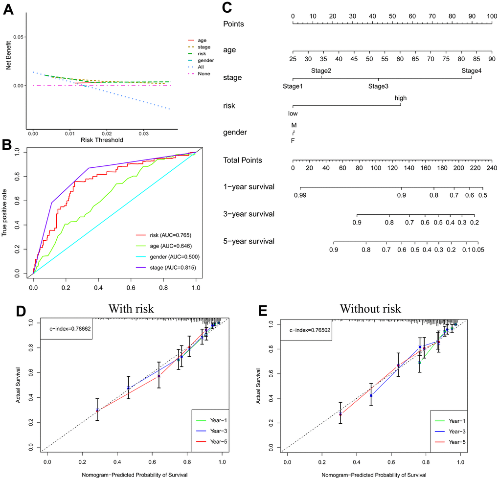 We used the R programming language “RMS” to create a prognostic nomogram using age, risk group, and tumor stage as factors to predict patient outcomes at 1, 3, and 5 years [12]. We also determined the value of this nomogram in prognosis prediction.