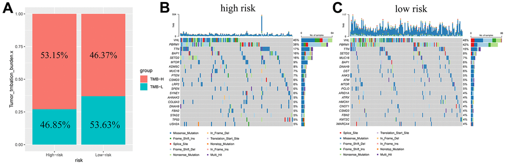 The TMB in patients was determined and found to be higher in the high-risk subgroup (Figure 7A). Based on this, we generated a waterfall plot of the top 20 mutant genes according to different subclusters (Figure 7B, 7C). The five most commonly mutated genes in the high-risk patients were VHL (45%), PBRM1 (38%), TTN (17%), BAP1 (16%), and SETD2 (16%). VHL (48%), PBRM1 (42%), TTN (15%), SETD2 (8%) and MUC16 (7%) were prone to mutation in low-risk patients.