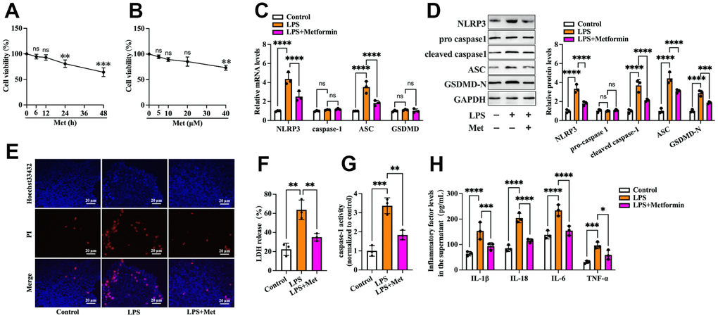 First, we detected the effects of metformin on the viability of human KGN cells. Cells were treated with various concentrations of metformin (0, 5, 10, 20, and 40 μM) for 12 h or 20 μM metformin for different durations (0, 6, 12, 24, and 48 h). The MTT assay showed that treatment with 20 μM metformin for 12 h had no significant cytotoxic effects (Figure 1A, 1B). Thus, 20 μM metformin for 12 h was chosen for the following experiments. To ascertain whether metformin affects KGN cell pyroptosis, the cells were divided into three groups: (1) the control group, (2) the LPS group, and (3) the LPS + metformin group. As shown in Figure 1, compared with the control group, exposure of KGN cells to LPS resulted in a significant increase in the expression of pyroptosis-related factors (NLRP3, ASC, cleaved caspase-1 and GSDMD-N), LDH release, and caspase-1 activity and a decrease in plasma membrane integrity (Figure 1C–1G). In addition, the secretion of proinflammatory factors, including IL-1β, IL-6, IL-18, and TNF-α, was also elevated (Figure 1H). Nevertheless, metformin treatment markedly compromised these effects (Figure 1C–1H), indicating that metformin could suppress LPS-induced cell pyroptosis and inflammation in human KGN cells.