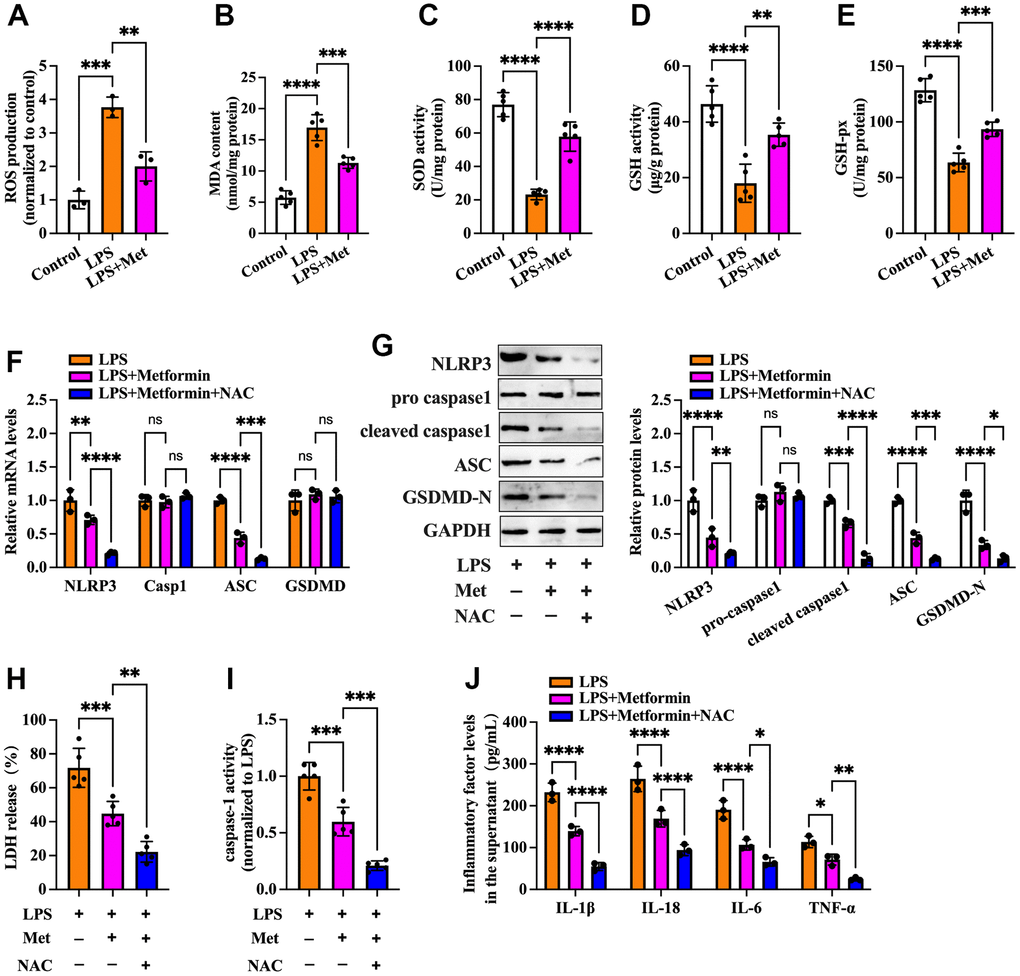 ROS are derived from molecular oxygen and are formed by redox reactions or electronic excitation. Oxidative stress, a phenomenon caused by an imbalance between radicals and antioxidant defense, is a primary pathophysiological mechanism in various human diseases [16]. It has been reported that ROS accumulation and increased oxidative stress are present in OGCs of PCOS patients [17, 18]. We next explored whether metformin influences cell pyroptosis and inflammation via antioxidant action. As shown in Figure 2A–2E, compared with the controls, treatment with LPS led to elevated ROS production and oxidative stress in KGN cells, as evidenced by increased levels of ROS and MDA and decreased levels of SOD, GSH, and GSH-px, whereas metformin treatment significantly repressed LPS-induced ROS production and oxidative stress. Notably, the inhibitory effects of metformin on the expression of pyroptosis-related factors (NLRP3, ASC, cleaved caspase-1, and GSDMD-N), LDH release, caspase-1 activity, and secretion of proinflammatory cytokines were more apparent after treatment with NAC, a ROS scavenger (Figure 2F–2J). These findings indicated that metformin suppresses pyroptosis and inflammation in human KGN cells by decreasing ROS production and oxidative stress.
