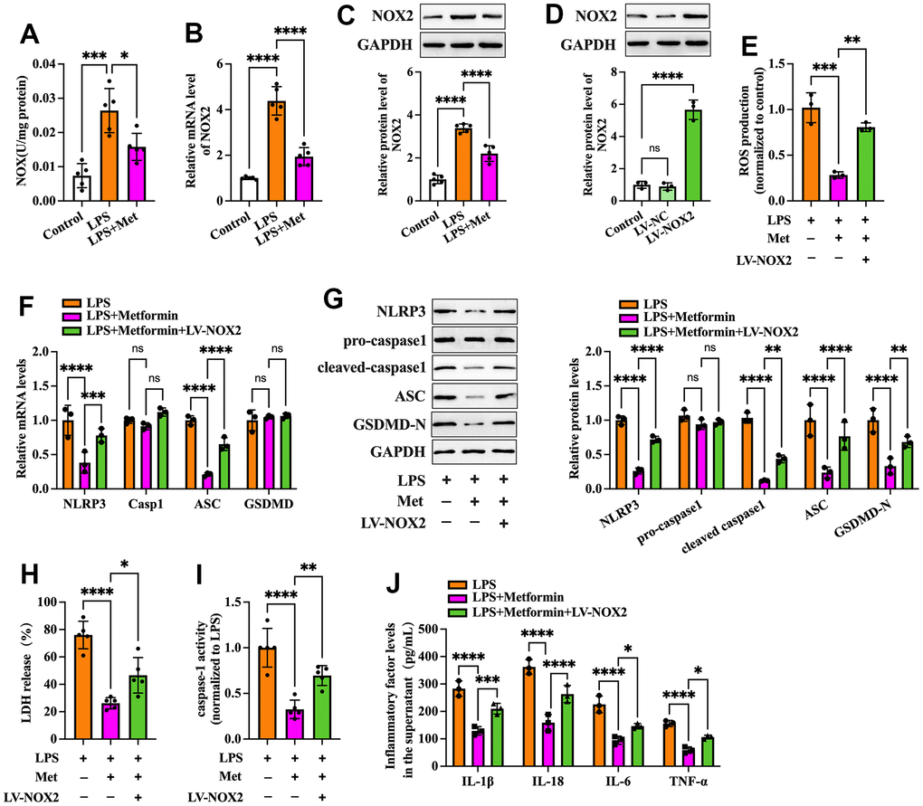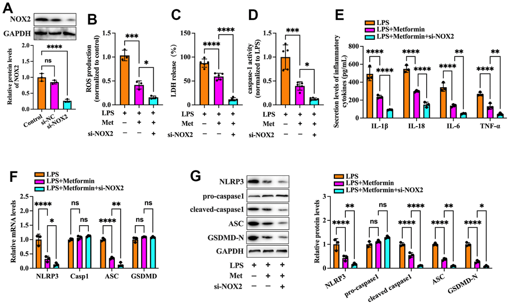 Nicotinamide adenine dinucleotide phosphate (NADPH) oxidases have been identified as one of the critical sources of ROS in many cells. NOX2 NADPH oxidase has been demonstrated to be involved in the ROS production mechanism in isolated GCs of PCOS patients [19]. We further ascertained whether metformin diminishes ROS-mediated pyroptosis and inflammation by inhibiting the expression of NOX2 in KGN cells. As shown in Figure 3A–3C, exposure to LPS significantly increased NOX activity and NOX2 expression compared to the controls, while metformin treatment abolished these effects. Next, we transfected KGN cells with LV-NC or LV-NOX2 for 48 h to overexpress NOX2. A more significant than 4.03-fold elevation of NOX2 levels was observed after transfection with LV-NOX2 (Figure 3D). Furthermore, the suppressive effects of metformin on ROS production, cell pyroptosis and secretion of proinflammatory factors were robustly compromised upon NOX2 overexpression (Figure 3E–3J). In contrast, transfection of NOX2 siRNA presented the opposite effects (Figure 4). Altogether, these data support the concept that the NOX2-ROS pathway is involved in metformin-induced repression of cell pyroptosis and inflammation in human KGN cells.