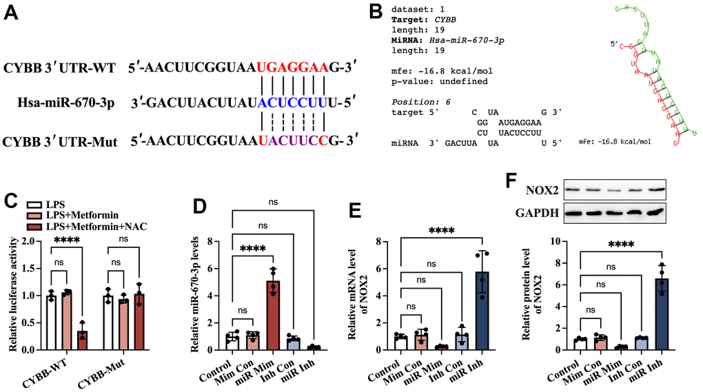 The genomic and miR-670-3p sequences were obtained from miRDB, which predicts miRNA targets in various species. TargetScan and miRBase web servers were used to identify miR-670-3p binding sites. The RNAhybrid website evaluated the minimum free energy of hybridization between miR-670-3p and NOX2 (encoded by the CYBB gene in humans).