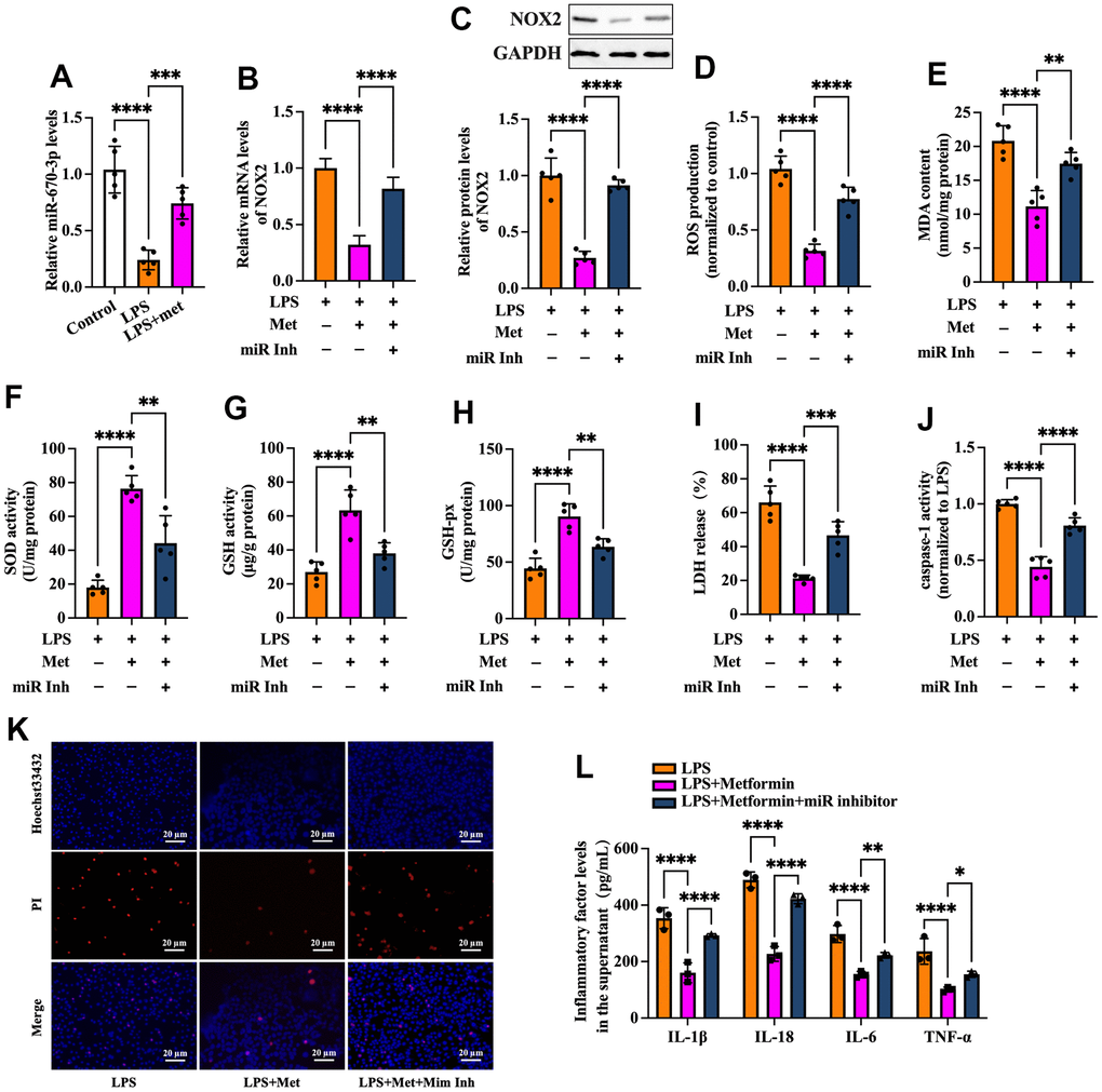 Based on the above studies, we speculated that miR-670-3p likely mediates metformin-induced suppression of the NOX2-ROS pathway and cell pyroptosis. To verify this possibility, RT-PCR was used to detect miR-670-3p expression in KGN cells treated with LPS or metformin. As shown in Figure 6A, exposure of KGN cells to LPS markedly decreased miR-670-3p levels, while metformin significantly compromised this effect. Subsequently, KGN cells were transfected with miR-670-3p inhibitor before metformin treatment. As shown in Figure 6B–6H, the negative effects of metformin on NOX2 expression, ROS production, and oxidative stress were primarily reversed by miR-670-3p inhibitor transfection. Furthermore, metformin-induced promotion of plasma membrane integrity and downregulation of LDH release, caspase-1 activity, and secretion of proinflammatory factors were also compromised by miR-670-3p suppression (Figure 6I–6L). These observations revealed that metformin inhibits the NOX2-ROS pathway, pyroptosis, and inflammation by upregulating miR-670-3p in KGN cells.