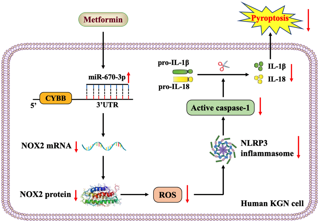 Taken together, the results of our study revealed that metformin elevates miR-670-3p levels and then decreases the transcription of the NOX2 gene, thereby reducing ROS production and activation of the NLRP3 inflammasome and ultimately ameliorating pyroptosis and inflammation in human KGN cells (Figure 7). miR-670-3p and NOX2 may be novel potential therapeutic targets for developing PCOS, which extend the understanding of metformin’s biological functions in gynecological diseases.