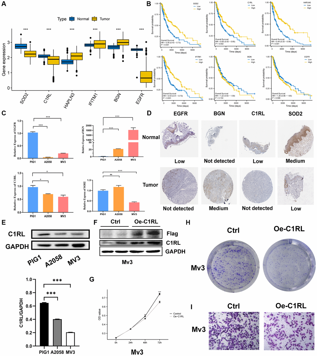Patients with high C1RL expression have longer Overall Survival (OS) time tested by Kaplan-Meier (KM) test (Figure 10B). We further investigate the protein level of C1RL in melanoma cell lines. Results from the Western blot assay shown protein level of C1RL were decreased in A2058 and MV3 cells compared with melanocyte PIG1 cells. The protein band were analyzed using Image J, and GAPDH protein was used as an internal control (Figure 10E). To explore the biological function of C1RL in SKCM, we used the lipo 3000 to add C1RL expression in MV3 cell lines. Western blot results presented that C1RL expression levels in overexpression cell lines was significantly rose compared to the control cells (Figure 10F). CCK8 assay presented that overexpression of C1RL inhibited cell proliferation (Figure 10G). Moreover, in vitro overexpression of C1RL suppressed the formation of clones (Figure 10H). Furthermore, MV3 cells migration capabilities were also impaired after C1RL Overexpression (Figure 10I).