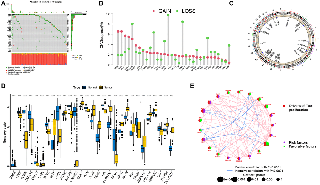 Thirty-three TRGs were identified in a recent study. These gene names and their full details of expression condition were listed, and the somatic mutations were represented by generating a waterfall plot with the maftools R package. Transcriptional mutation data of the 33 TRGs (Supplementary Table 5) were retrieved from the TCGA database for analyzing the copy number variation (CNV) frequency and corresponding location information. Using the limma R package, the Wilcoxon signed-rank test was used to compare TRG expression between normal and tumor tissues. The p-value of survival analysis for TRGs was calculated using the Log-rank test, and the interactions among the TRGs were also explored using correlation analysis.