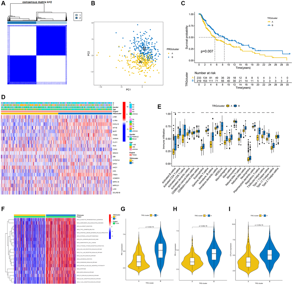 To further understand the impact of TRGs on survival in SKCM patients, a consensus clustering algorithm based on 33 TRG expression levels was used to classify all SKCM patients into two TRG molecular clusters (Figure 3A). According to the study results, k = 2 was an effective option for cluster A patient’s classifications (n = 241) and cluster B (n = 227). Next, a PCA analysis was performed on the two TRG molecular subtype groups, revealing significant differences in the TRG expression conditions (Figure 3B). Based on the KM curves, patients with cluster B had a better survival time than patients with cluster A (p = 0.007; Figure 3C). The association between the clinical characteristics, TRG cluster, and TRG expression is shown in a heatmap (Figure 3D). The ssGSEA results revealed higher immune cell infiltration levels in molecular cluster B than in molecular cluster A (Figure 3E). GSVA demonstrated significant enrichment of important biological pathways in subtype B, including leukocyte transendothelial migration, complement-and-coagulation-cascades, etc. (Figure 3F). Furthermore, our results showed higher PD1, PD-L1, and CTLA- 4 genes in subtype B expression levels, (Figure 3G–3I) compared to subtype A.