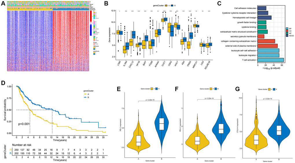 KM curves revealed better survival for patients with gene cluster B compared to cluster A (log-rank test, p < 0.001; Figure 4D). Meanwhile, elevated expression of PD1, PD-L1 and CTLA-4 genes was shown in gene cluster B (Figure 4E–4G).